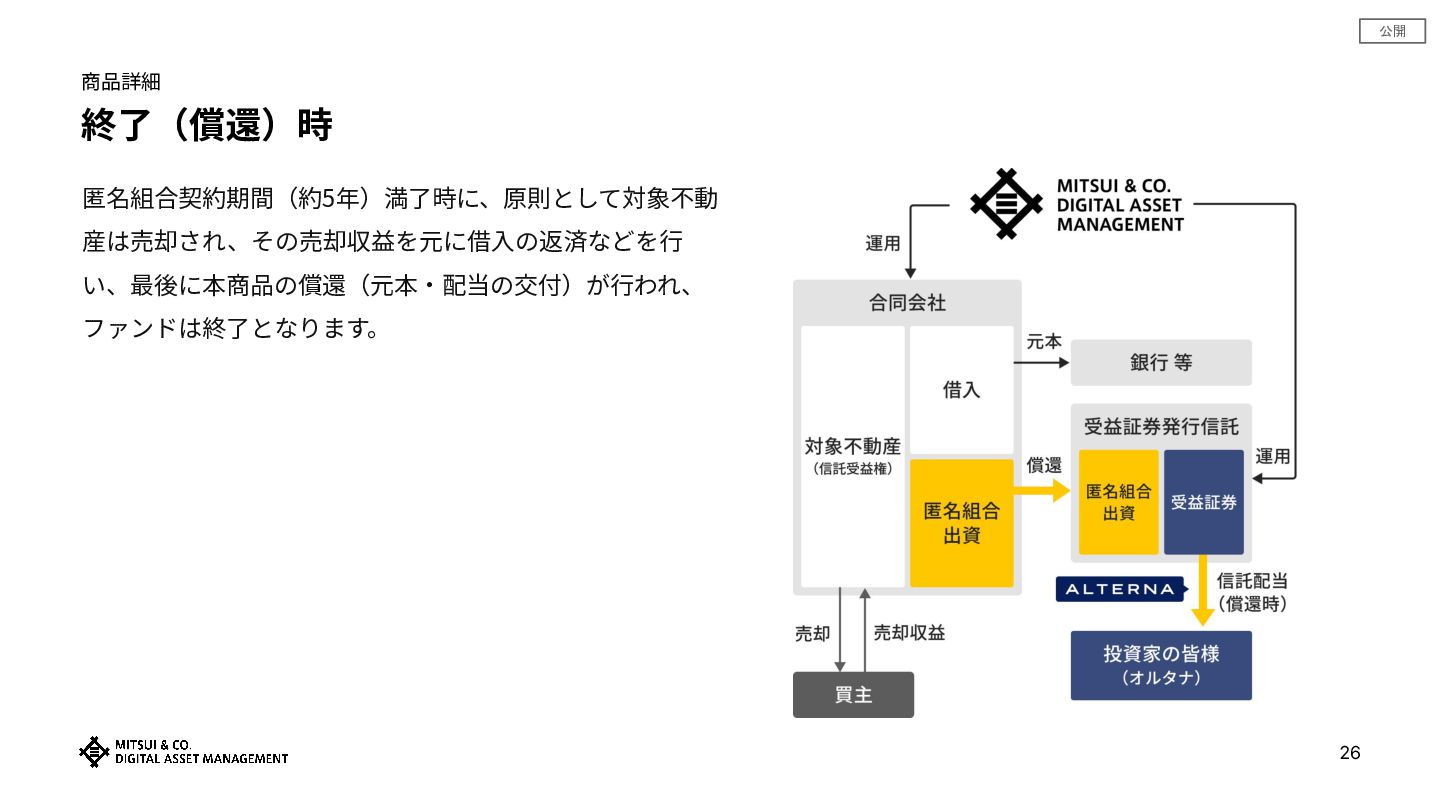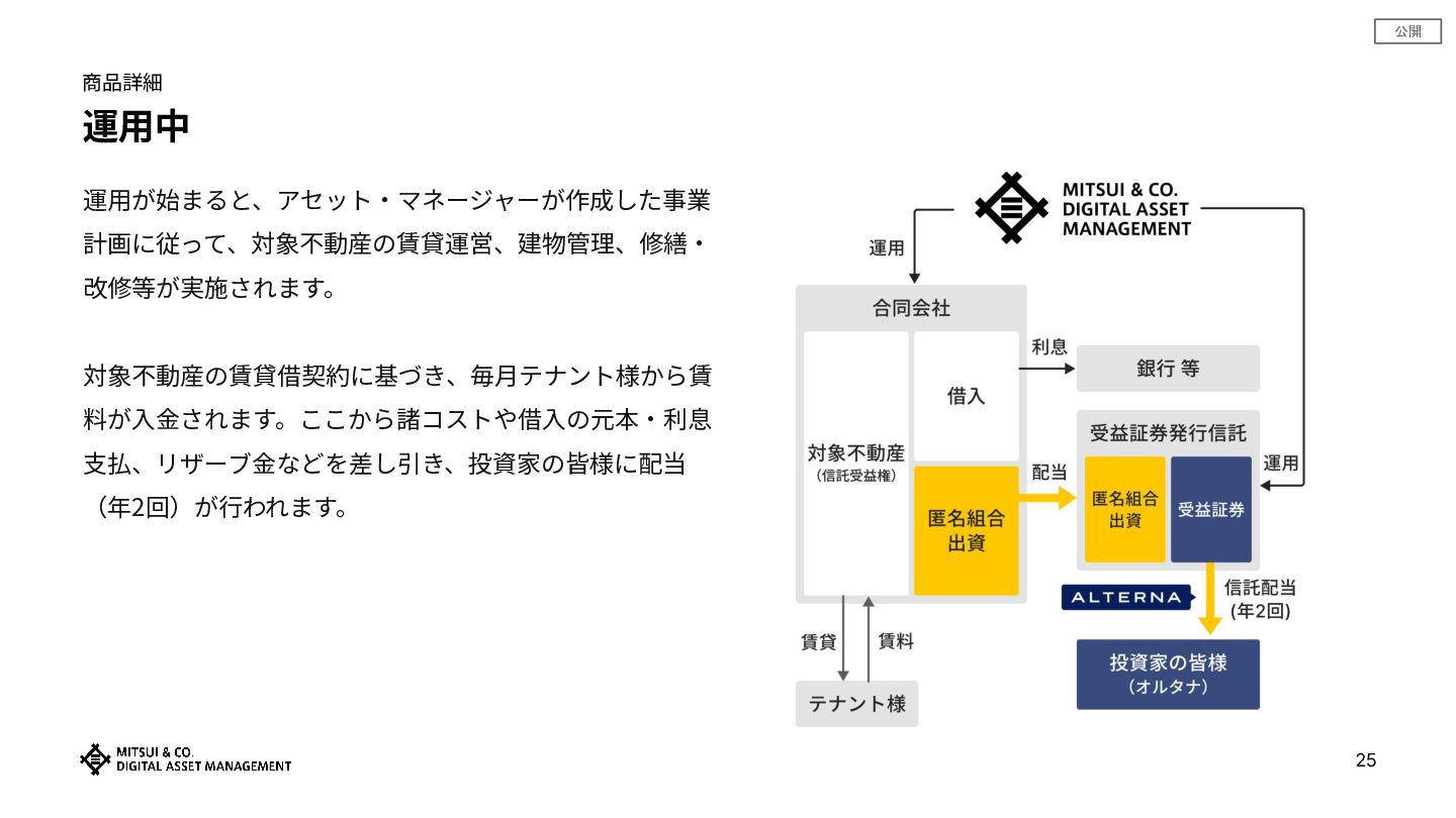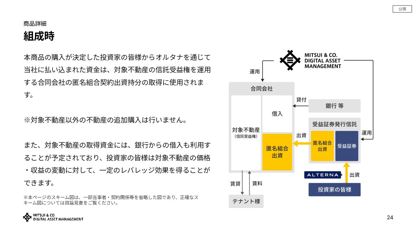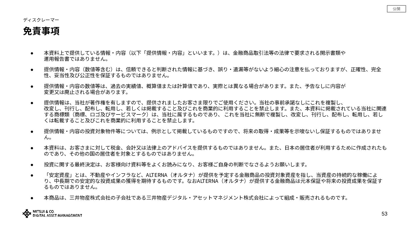 • 提供情報‧内容の数値等は、過去の実績値、概算値または計算値であり、実際とは異なる場合があります。また、予告なしに内容が 変更⼜は廃⽌される場合があります。 • 提供情報は、当社が著作権を有しますので、提供されましたお客さま限りでご使⽤ください。当社の事前承諾なしにこれを複製し、 改変し、刊⾏し、配布し、転⽤し、若しくは掲載すること及びこれを商業的に利⽤することを禁⽌します。また、本資料に掲載されている当社に関連 する商標類(商標、ロゴ及びサービスマーク)は、当社に属するものであり、 これを当社に無断で複製し、改変し、刊⾏し、配布し、転⽤し、若し くは転載すること及びこれを商業的に利⽤することを禁⽌します。 • 提供情報‧内容の投資対象物件等については、例⽰として掲載しているものですので、将来の取得‧成果等を⽰唆ないし保証するものではありませ ん。 • 本資料は、お客さまに対して税⾦、会計⼜は法律上のアドバイスを提供するものではありません。また、⽇本の居住者が利⽤するために作成されたも のであり、その他の国の居住者を対象とするものではありません。 • 投資に関する最終決定は、お客様向け資料等をよくお読みになり、お客様ご⾃⾝の判断でなさるようお願いします。 • 「安定資産」とは、不動産やインフラなど、ALTERNA(オルタナ)が提供を予定する⾦融商品の投資対象資産を指し、当資産の持続的な稼働によ り、中⻑期での安定的な投資成果の獲得を期待するものです。なおALTERNA(オルタナ)が提供する⾦融商品は元本保証や将来の投資成果を保証す るものではありません。 • 本商品は、三井物産株式会社の⼦会社である三井物産デジタル‧アセットマネジメント株式会社によって組成‧販売されるものです。