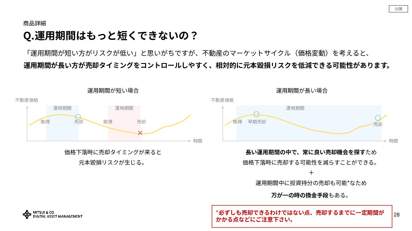 公開 商品詳細 Q.運⽤期間はもっと短くできないの? 28 「運⽤期間が短い⽅がリスクが低い」と思いがちですが、不動産のマーケットサイクル(価格変動)を考えると、 運⽤期間が⻑い⽅が売却タイミングをコントロールしやすく、相対的に元本毀損リスクを低減できる可能性があります。 不動産価格 時間 × 運⽤期間