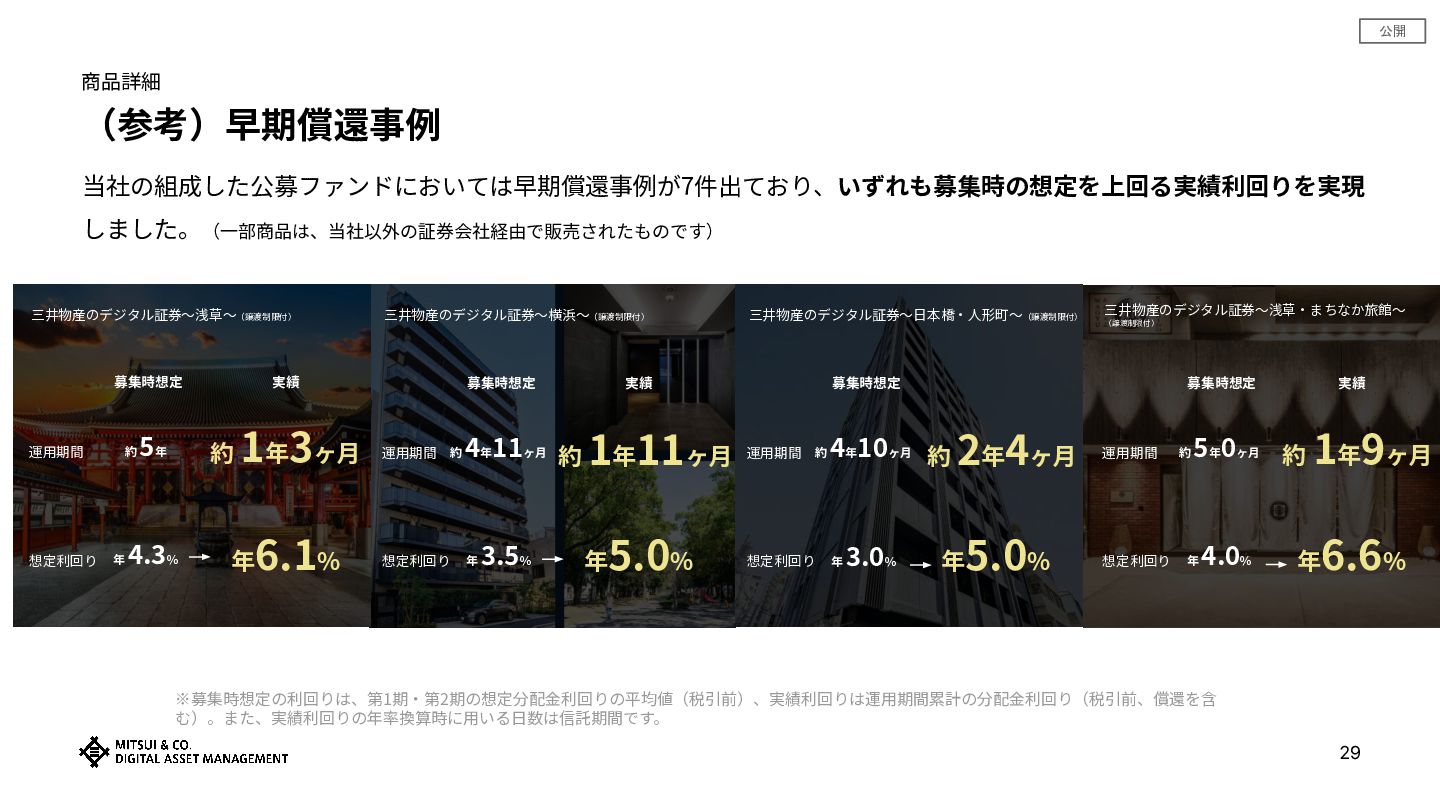 公開 商品詳細 (参考)早期償還事例 当社の組成した公募ファンドにおいては早期償還事例が7件出ており、いずれも募集時の想定を上回る実績利回りを実現 しました。(⼀部商品は、当社以外の証券会社経由で販売されたものです) ※募集時想定の利回りは、第1期‧第2期の想定分配⾦利回りの平均値(税引前)、実績利回りは運⽤期間累計の分配⾦利回り(税引前、償還を含 む)。また、実績利回りの年率換算時に⽤いる⽇数は信託期間です。 29 三井物産のデジタル証券〜横浜〜(譲渡制限付) 運⽤期間