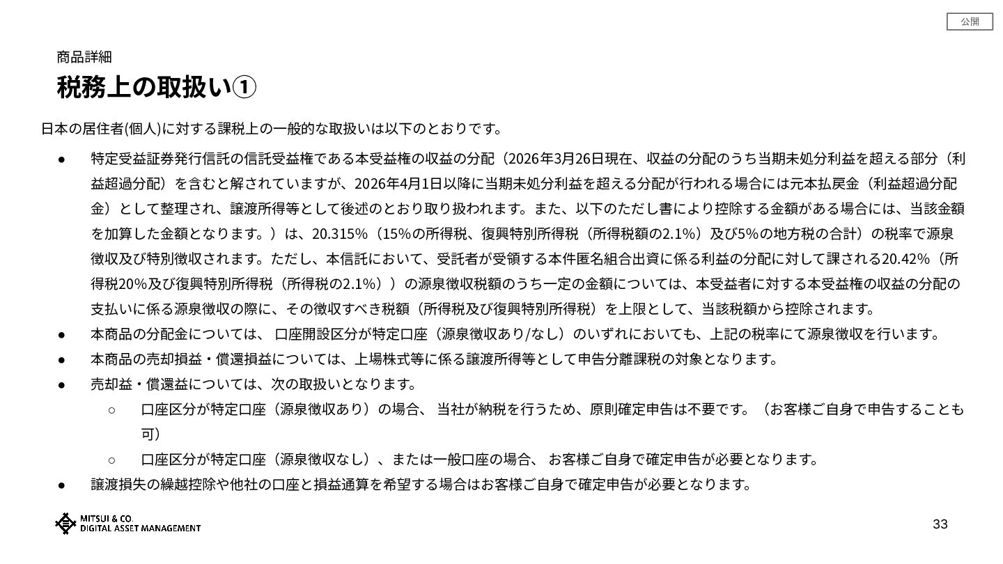 公開 税務上の取扱い① 33 商品詳細 ⽇本の居住者(個⼈)に対する課税上の⼀般的な取扱いは以下のとおりです。 • 特定受益証券発⾏信託の信託受益権である本受益権の収益の分配(2026年3⽉26⽇現在、収益の分配のうち当期未処分利益を超える部分(利 益超過分配)を含むと解されていますが、2026年4⽉1⽇以降に当期未処分利益を超える分配が⾏われる場合には元本払戻⾦(利益超過分配 ⾦)として整理され、譲渡所得等として後述のとおり取り扱われます。また、以下のただし書により控除する⾦額がある場合には、当該⾦額 を加算した⾦額となります。)は、20.315%(15%の所得税、復興特別所得税(所得税額の2.1%)及び5%の地⽅税の合計)の税率で源泉