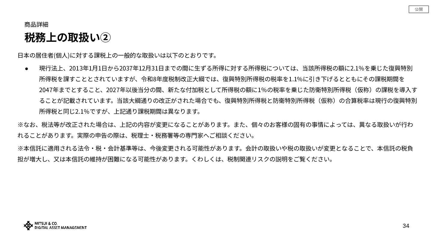 公開 税務上の取扱い② 34 商品詳細 ⽇本の居住者(個⼈)に対する課税上の⼀般的な取扱いは以下のとおりです。 • 現⾏法上、2013年1⽉1⽇から2037年12⽉31⽇までの間に⽣ずる所得に対する所得税については、当該所得税の額に2.1%を乗じた復興特別 所得税を課すこととされていますが、令和8年度税制改正⼤綱では、復興特別所得税の税率を1.1%に引き下げるとともにその課税期間を 2047年までとすること、2027年以後当分の間、新たな付加税として所得税の額に1%の税率を乗じた防衛特別所得税(仮称)の課税を導⼊す ることが記載されています。当該⼤綱通りの改正がされた場合でも、復興特別所得税と防衛特別所得税(仮称)の合算税率は現⾏の復興特別