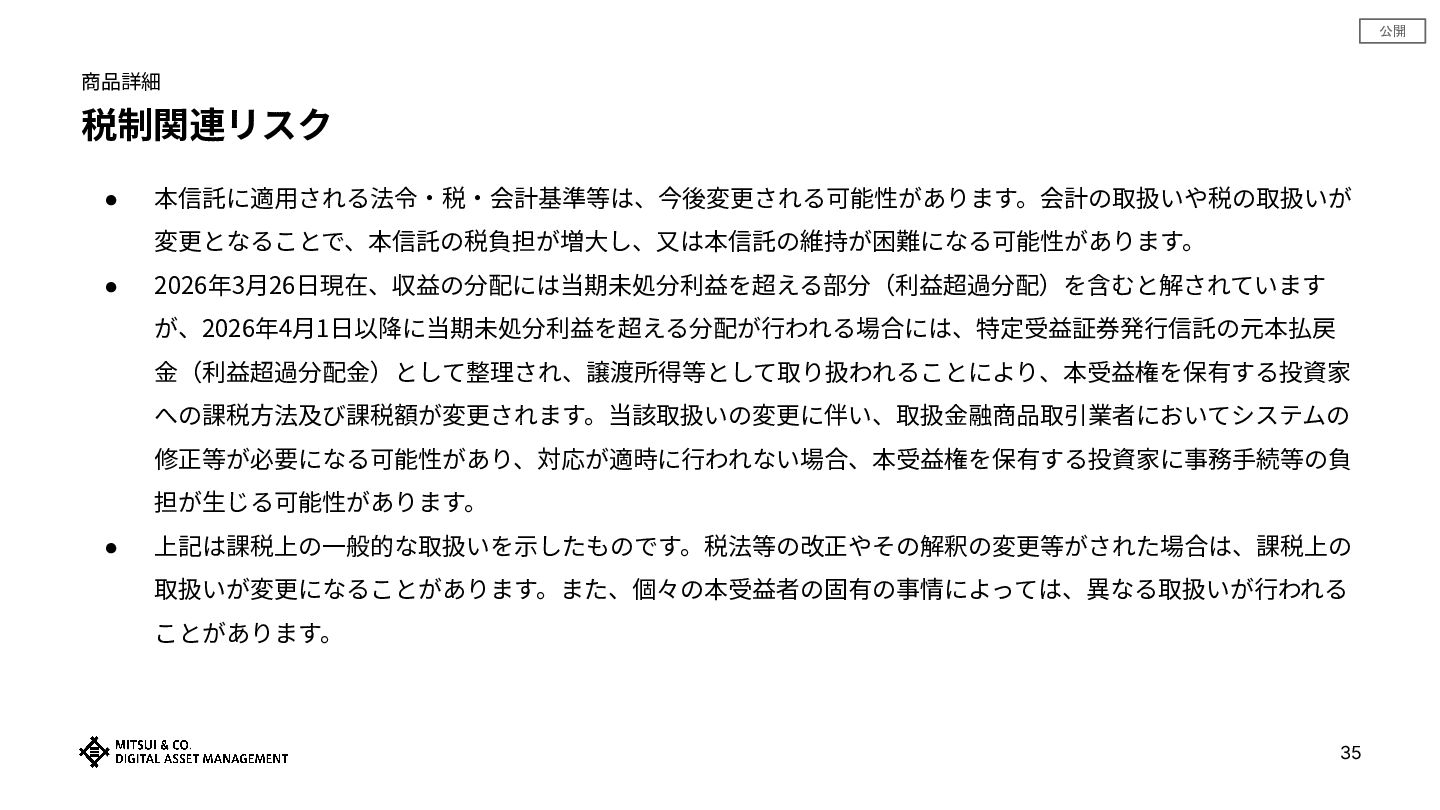 公開 • 本信託に適⽤される法令‧税‧会計基準等は、今後変更される可能性があります。会計の取扱いや税の取扱いが 変更となることで、本信託の税負担が増⼤し、⼜は本信託の維持が困難になる可能性があります。 • 2026年3⽉26⽇現在、収益の分配には当期未処分利益を超える部分(利益超過分配)を含むと解されています が、2026年4⽉1⽇以降に当期未処分利益を超える分配が⾏われる場合には、特定受益証券発⾏信託の元本払戻 ⾦(利益超過分配⾦)として整理され、譲渡所得等として取り扱われることにより、本受益権を保有する投資家 への課税⽅法及び課税額が変更されます。当該取扱いの変更に伴い、取扱⾦融商品取引業者においてシステムの 修正等が必要になる可能性があり、対応が適時に⾏われない場合、本受益権を保有する投資家に事務⼿続等の負
