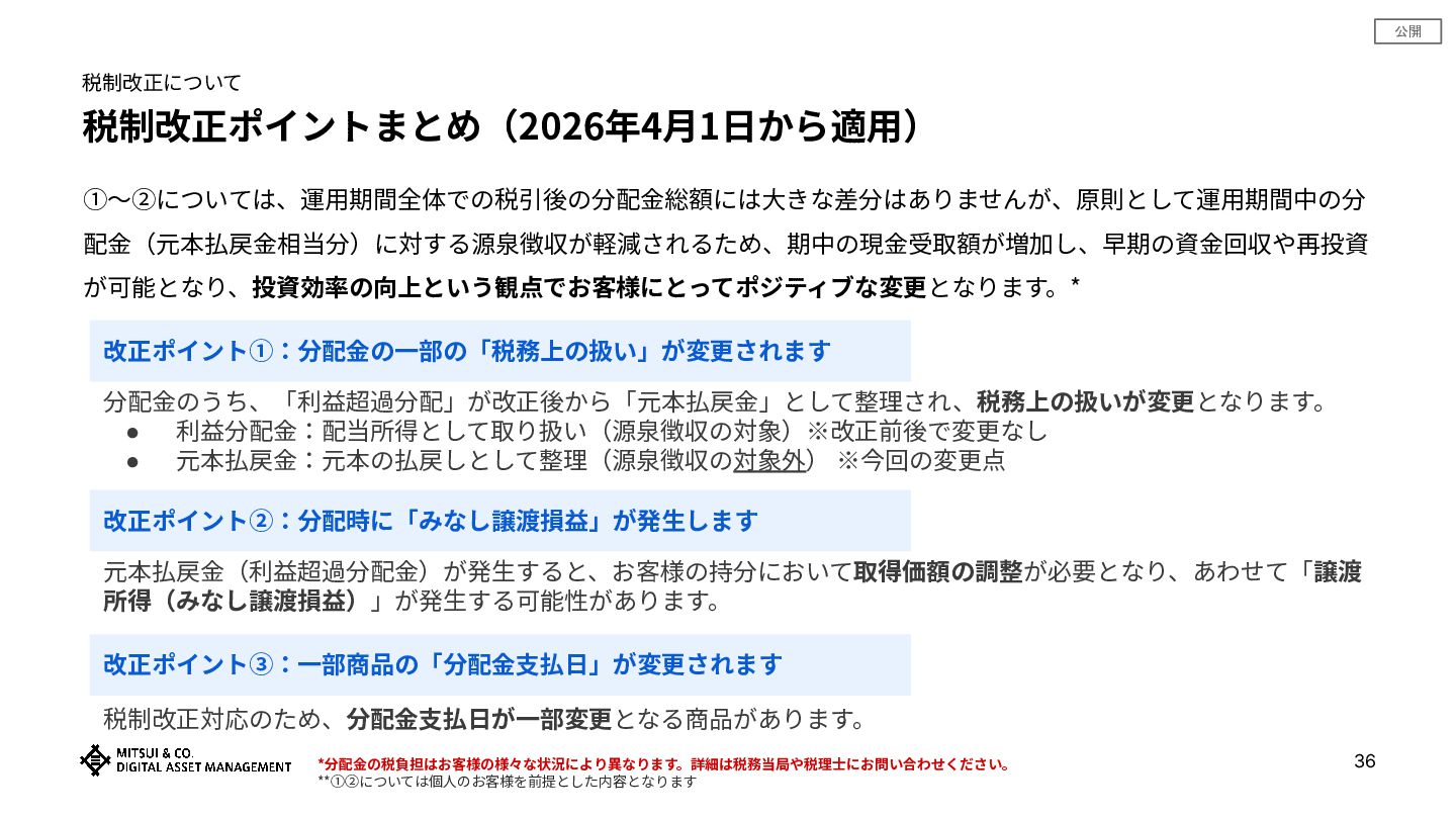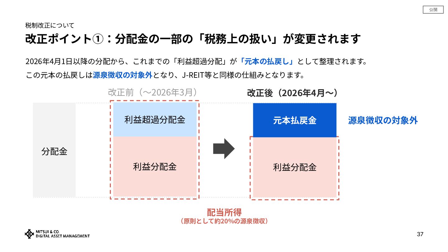 公開 税制改正ポイントまとめ(2026年4⽉1⽇から適⽤) 36 分配⾦のうち、「利益超過分配」が改正後から「元本払戻⾦」として整理され、税務上の扱いが変更となります。 • 利益分配⾦:配当所得として取り扱い(源泉徴収の対象)※改正前後で変更なし • 元本払戻⾦:元本の払戻しとして整理(源泉徴収の対象外) ※今回の変更点 改正ポイント①:分配⾦の⼀部の「税務上の扱い」が変更されます