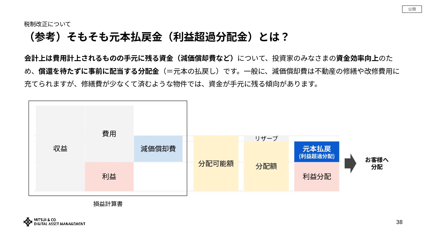 公開 改正ポイント①:分配⾦の⼀部の「税務上の扱い」が変更されます 37 2026年4⽉1⽇以降の分配から、これまでの「利益超過分配」が「元本の払戻し」として整理されます。 この元本の払戻しは源泉徴収の対象外となり、J-REIT等と同様の仕組みとなります。 改正前(〜2026年3⽉) 利益超過分配⾦ 利益分配⾦ 配当所得 (原則として約20%の源泉徴収)