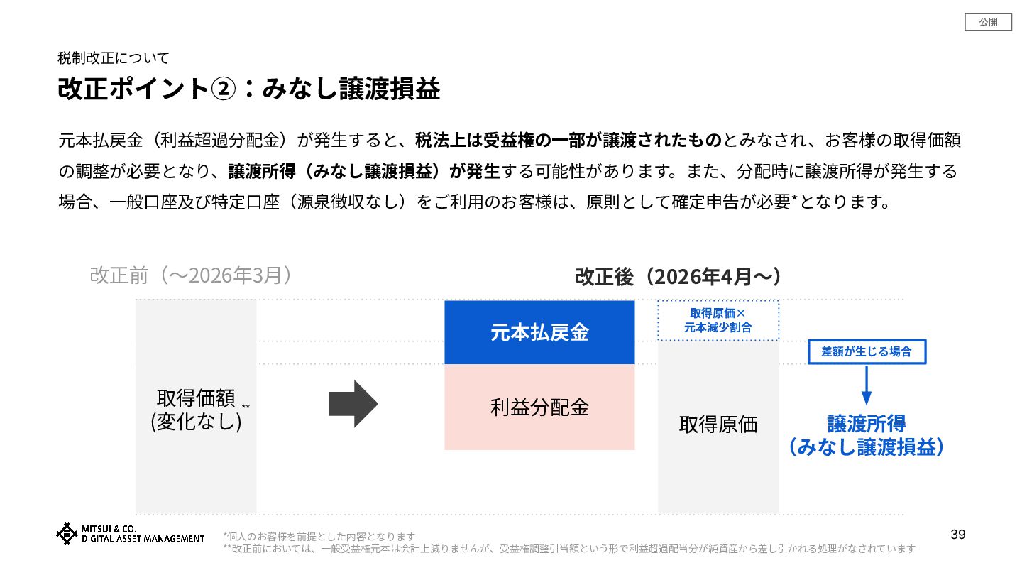公開 改正ポイント②:みなし譲渡損益 39 元本払戻⾦(利益超過分配⾦)が発⽣すると、税法上は受益権の⼀部が譲渡されたものとみなされ、お客様の取得価額 の調整が必要となり、譲渡所得(みなし譲渡損益)が発⽣する可能性があります。また、分配時に譲渡所得が発⽣する 場合、⼀般⼝座及び特定⼝座(源泉徴収なし)をご利⽤のお客様は、原則として確定申告が必要*となります。 改正前(〜2026年3⽉) 改正後(2026年4⽉〜) 元本払戻⾦ 利益分配⾦