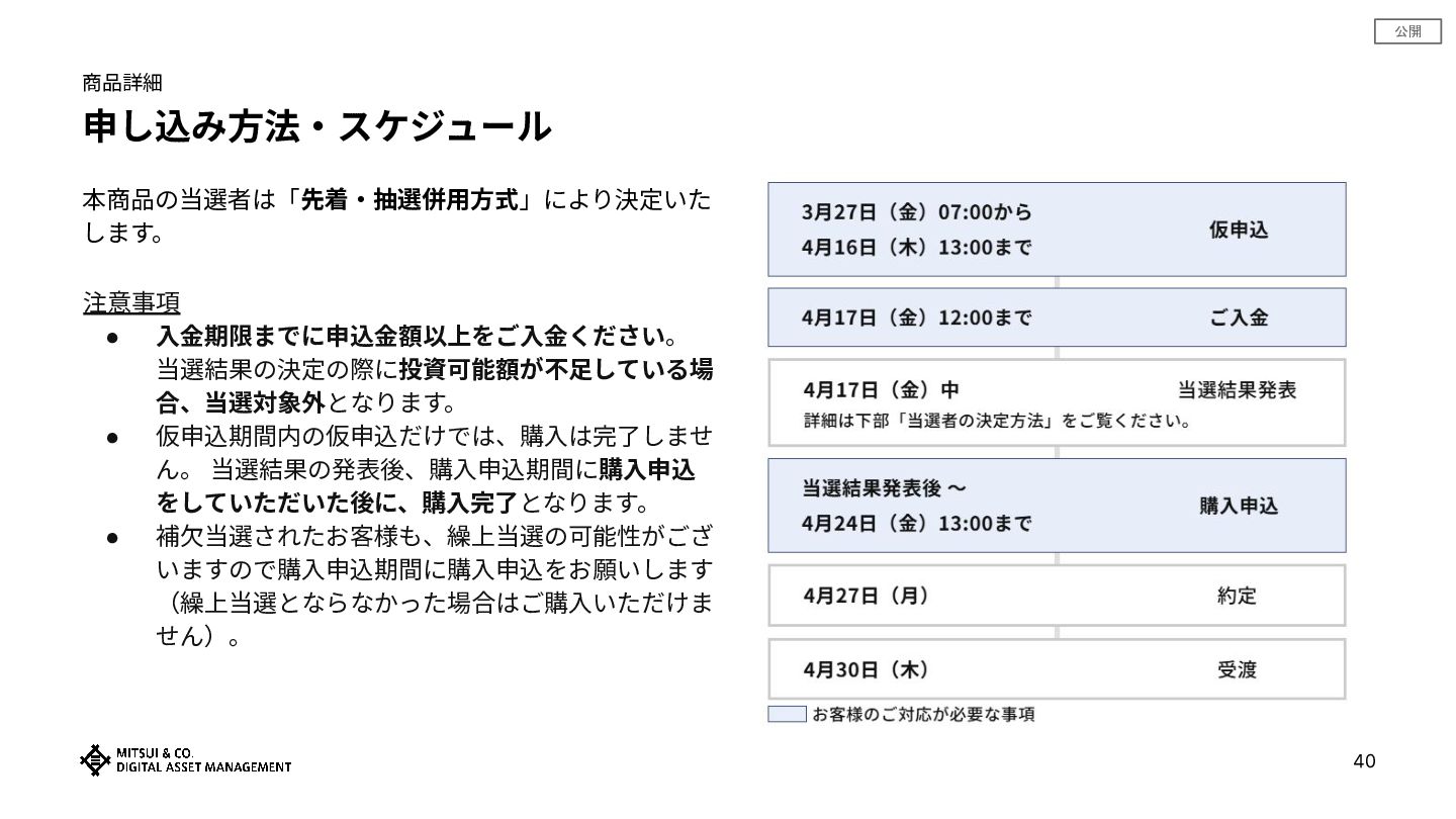 公開 申し込み⽅法‧スケジュール 注意事項 • ⼊⾦期限までに申込⾦額以上をご⼊⾦ください。 当選結果の決定の際に投資可能額が不⾜している場 合、当選対象外となります。 • 仮申込期間内の仮申込だけでは、購⼊は完了しませ ん。