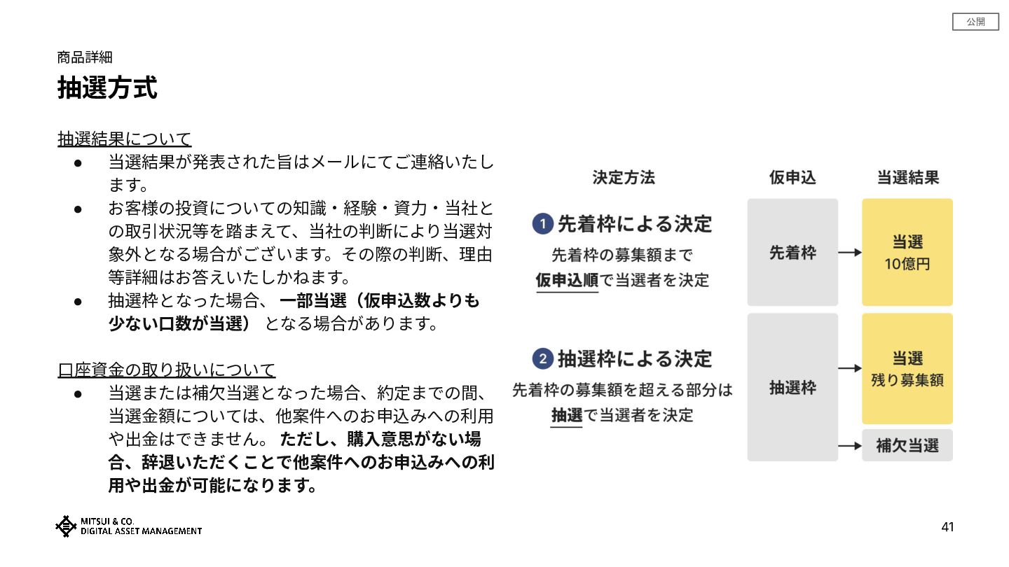 公開 抽選⽅式 抽選結果について • 当選結果が発表された旨はメールにてご連絡いたし ます。 • お客様の投資についての知識‧経験‧資⼒‧当社と の取引状況等を踏まえて、当社の判断により当選対 象外となる場合がございます。その際の判断、理由