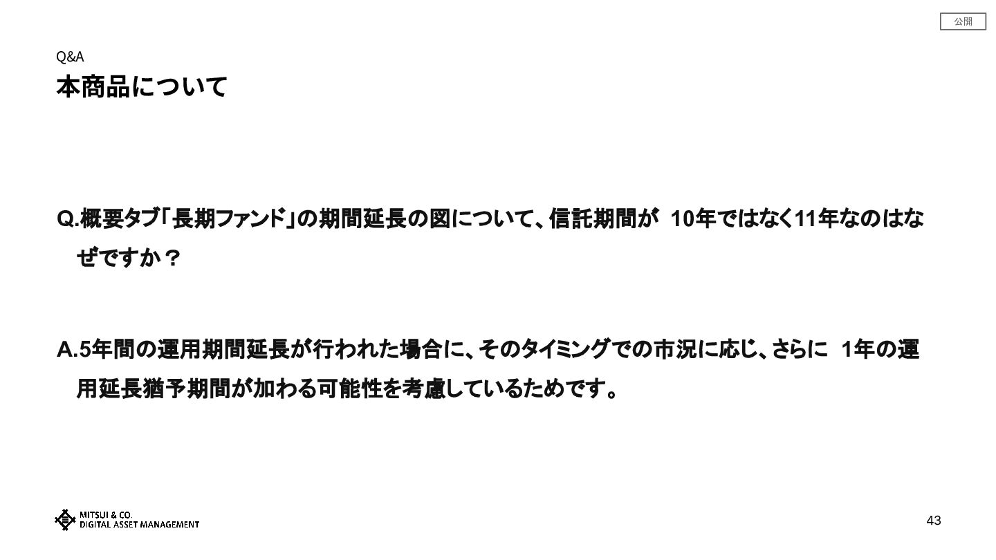 公開 Q&A 本商品について Q.概要タブ「長期ファンド」の期間延長の図について、信託期間が 10年ではなく11年なのはな ぜですか? A.5年間の運用期間延長が行われた場合に、そのタイミングでの市況に応じ、さらに 1年の運 用延長猶予期間が加わる可能性を考慮しているためです。 43