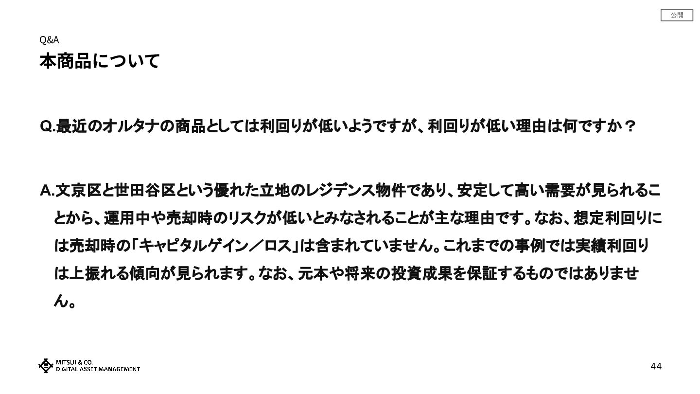 公開 Q&A 本商品について 44 Q.最近のオルタナの商品としては利回りが低いようですが、利回りが低い理由は何ですか? A.文京区と世田谷区という優れた立地のレジデンス物件であり、安定して高い需要が見られるこ とから、運用中や売却時のリスクが低いとみなされることが主な理由です。なお、想定利回りに は売却時の「キャピタルゲイン/ロス」は含まれていません。これまでの事例では実績利回り は上振れる傾向が見られます。なお、元本や将来の投資成果を保証するものではありませ ん。