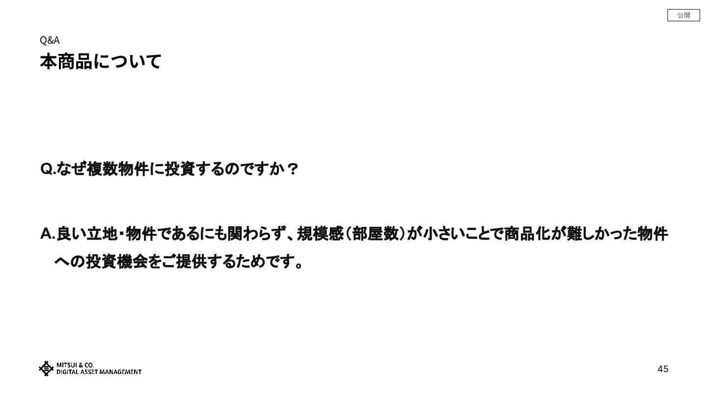 公開 Q&A 本商品について 45 Q.なぜ複数物件に投資するのですか? A.良い立地・物件であるにも関わらず、規模感(部屋数)が小さいことで商品化が難しかった物件 への投資機会をご提供するためです。