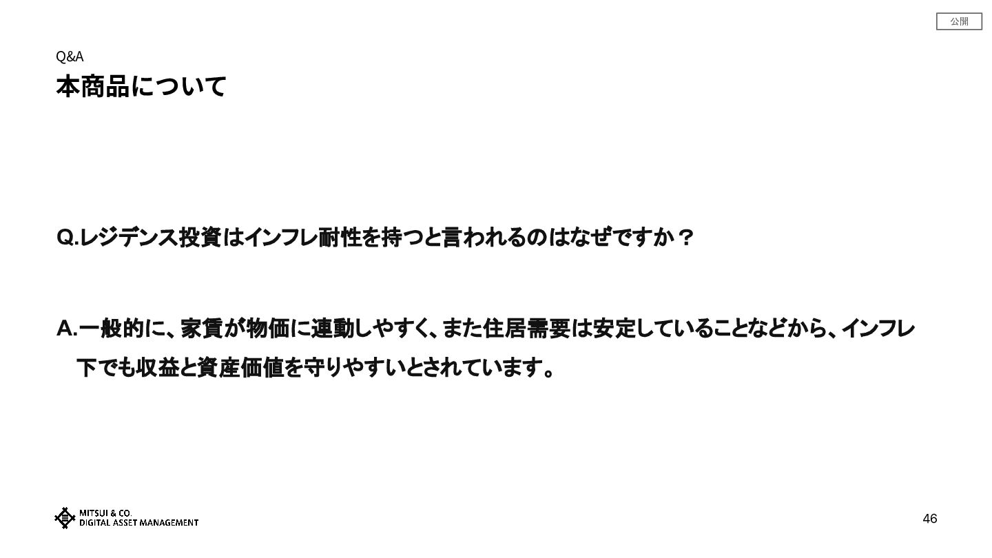 公開 Q&A 本商品について Q.レジデンス投資はインフレ耐性を持つと言われるのはなぜですか? A.一般的に、家賃が物価に連動しやすく、また住居需要は安定していることなどから、インフレ 下でも収益と資産価値を守りやすいとされています。 46
