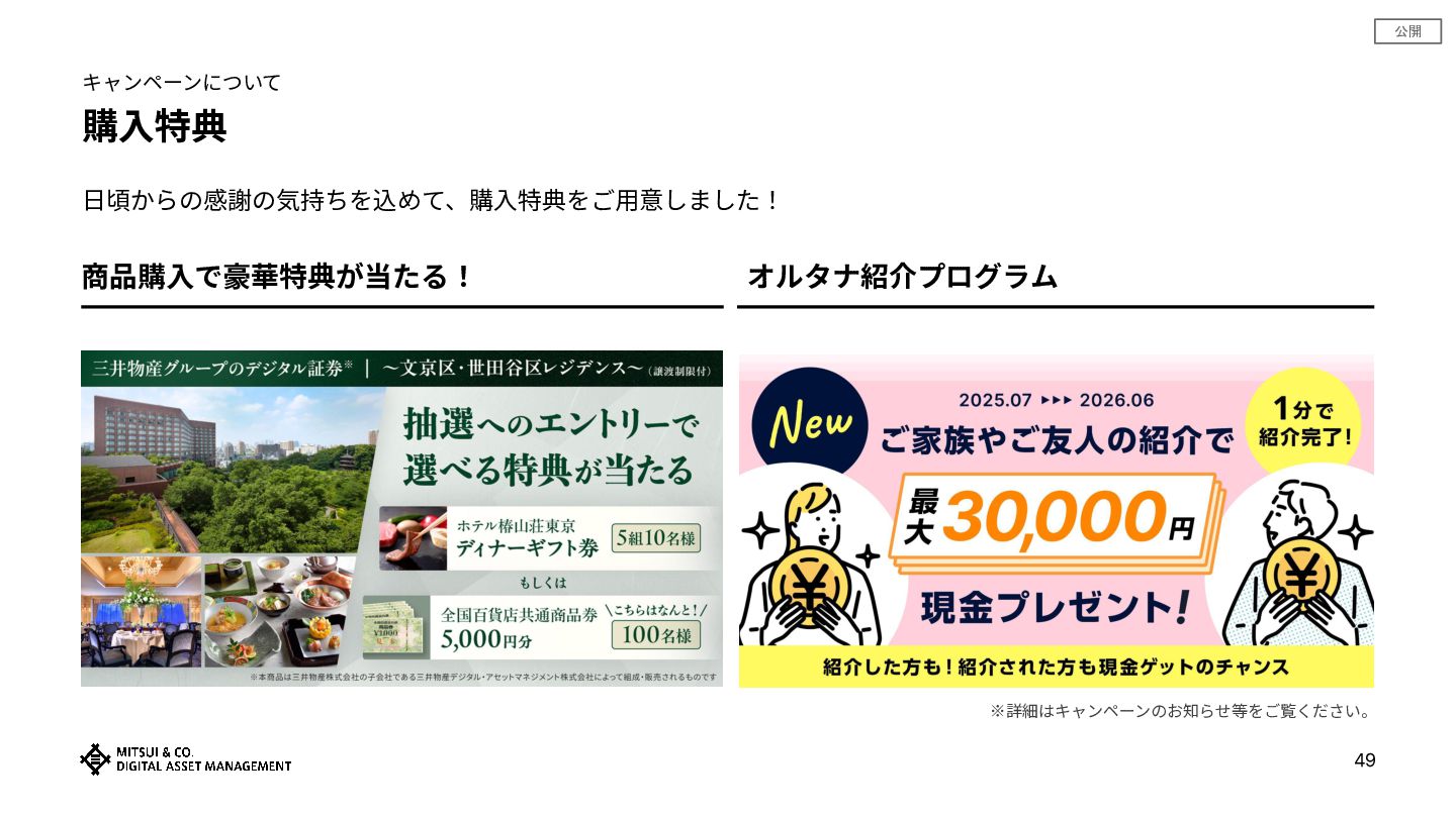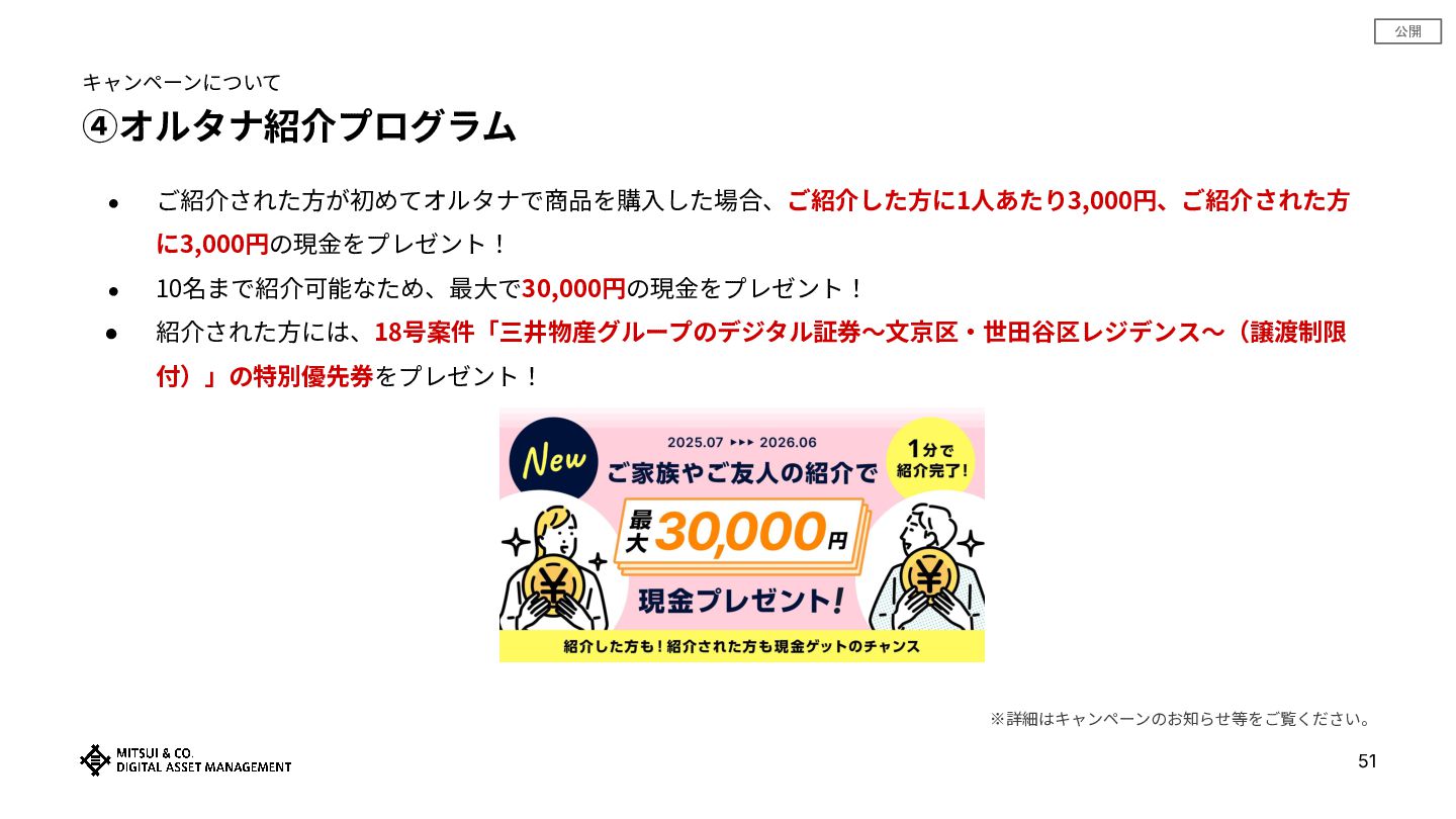 公開 ④オルタナ紹介プログラム • ご紹介された⽅が初めてオルタナで商品を購⼊した場合、ご紹介した⽅に1⼈あたり3,000円、ご紹介された⽅ に3,000円の現⾦をプレゼント! • 10名まで紹介可能なため、最⼤で30,000円の現⾦をプレゼント! • 紹介された⽅には、18号案件「三井物産グループのデジタル証券〜⽂京区‧世⽥⾕区レジデンス〜(譲渡制限 付)」の特別優先券をプレゼント!