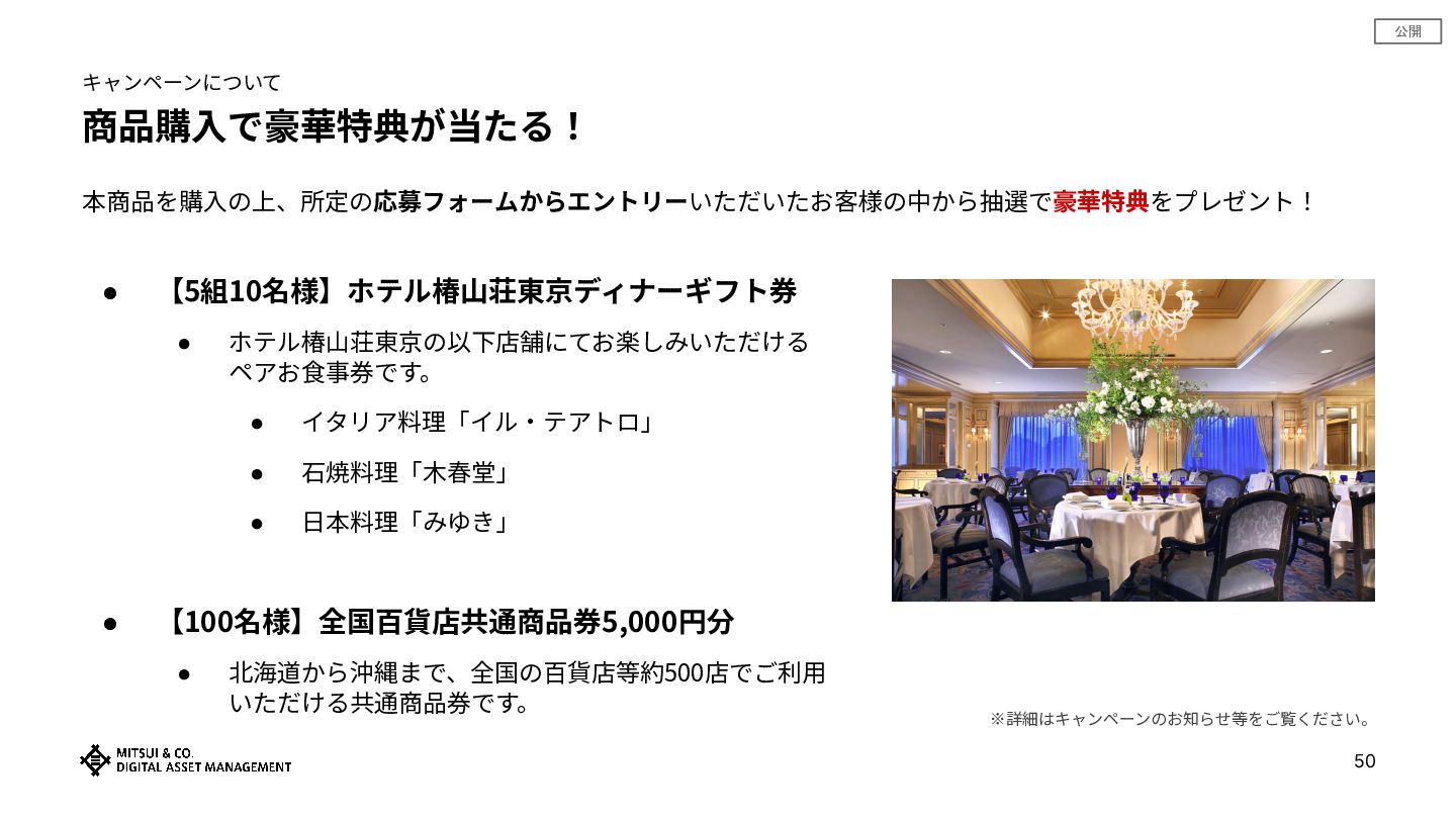 公開 53 ディスクレーマー 免責事項 • 本資料上で提供している情報‧内容(以下「提供情報‧内容」といいます。)は、⾦融商品取引法等の法律で要求される開⽰書類や 運⽤報告書ではありません。 • 提供情報‧内容(数値等含む)は、信頼できると判断された情報に基づき、誤り‧遺漏等がないよう細⼼の注意を払っておりますが、正確性、完全 性、妥当性及び公正性を保証するものではありません。
