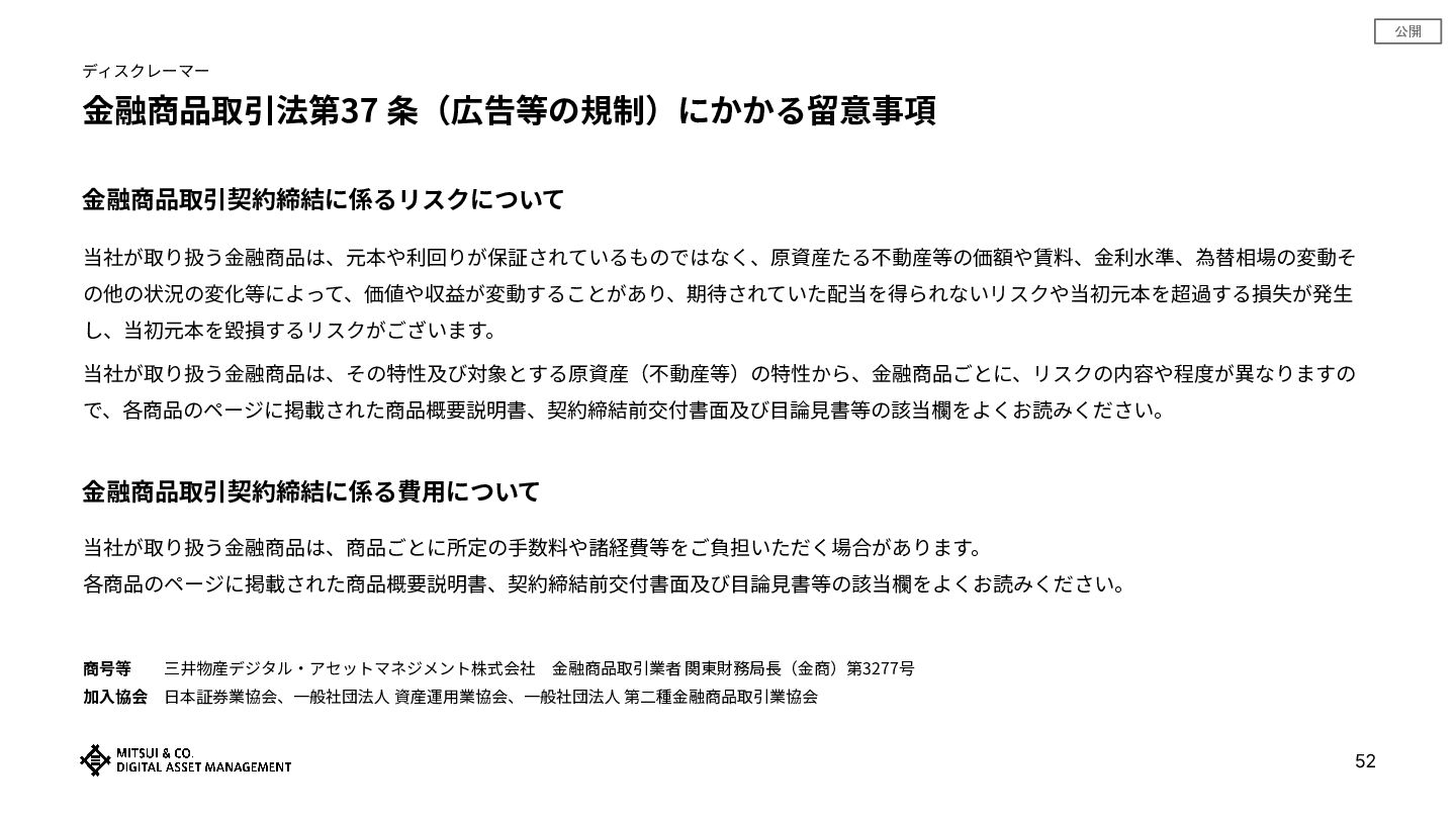 公開 52 ディスクレーマー ⾦融商品取引法第37 条(広告等の規制)にかかる留意事項 ⾦融商品取引契約締結に係るリスクについて 当社が取り扱う⾦融商品は、元本や利回りが保証されているものではなく、原資産たる不動産等の価額や賃料、⾦利⽔準、為替相場の変動そ の他の状況の変化等によって、価値や収益が変動することがあり、期待されていた配当を得られないリスクや当初元本を超過する損失が発⽣ し、当初元本を毀損するリスクがございます。 当社が取り扱う⾦融商品は、その特性及び対象とする原資産(不動産等)の特性から、⾦融商品ごとに、リスクの内容や程度が異なりますの