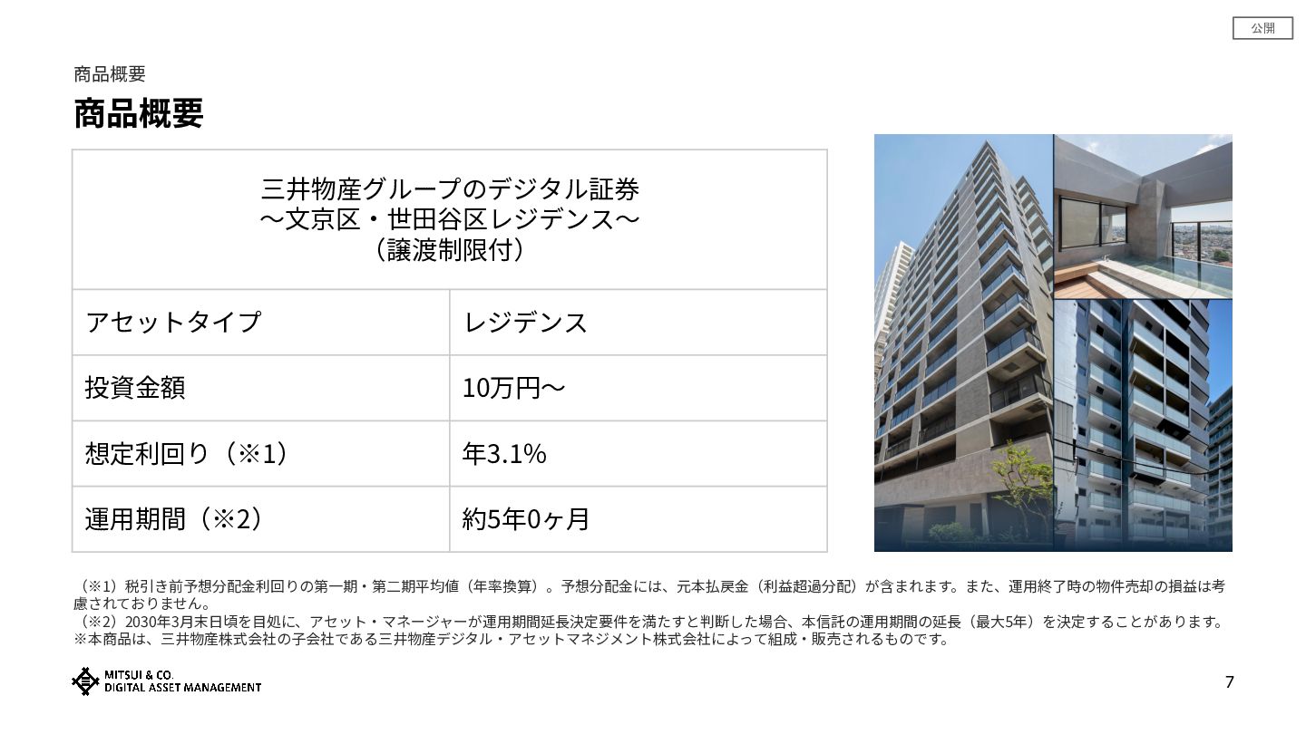 公開 7 商品概要 商品概要 三井物産グループのデジタル証券 〜⽂京区‧世⽥⾕区レジデンス〜 (譲渡制限付) アセットタイプ レジデンス 投資⾦額