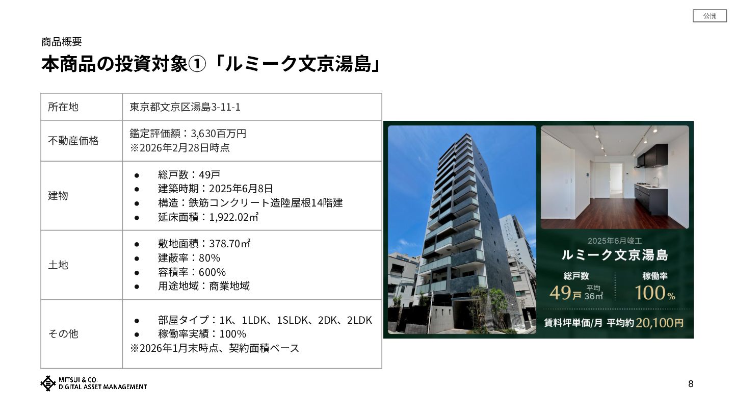 公開 商品概要 本商品の投資対象①「ルミーク⽂京湯島」 8 所在地 東京都⽂京区湯島3-11-1 不動産価格 鑑定評価額:3,630百万円 ※2026年2⽉28⽇時点 建物