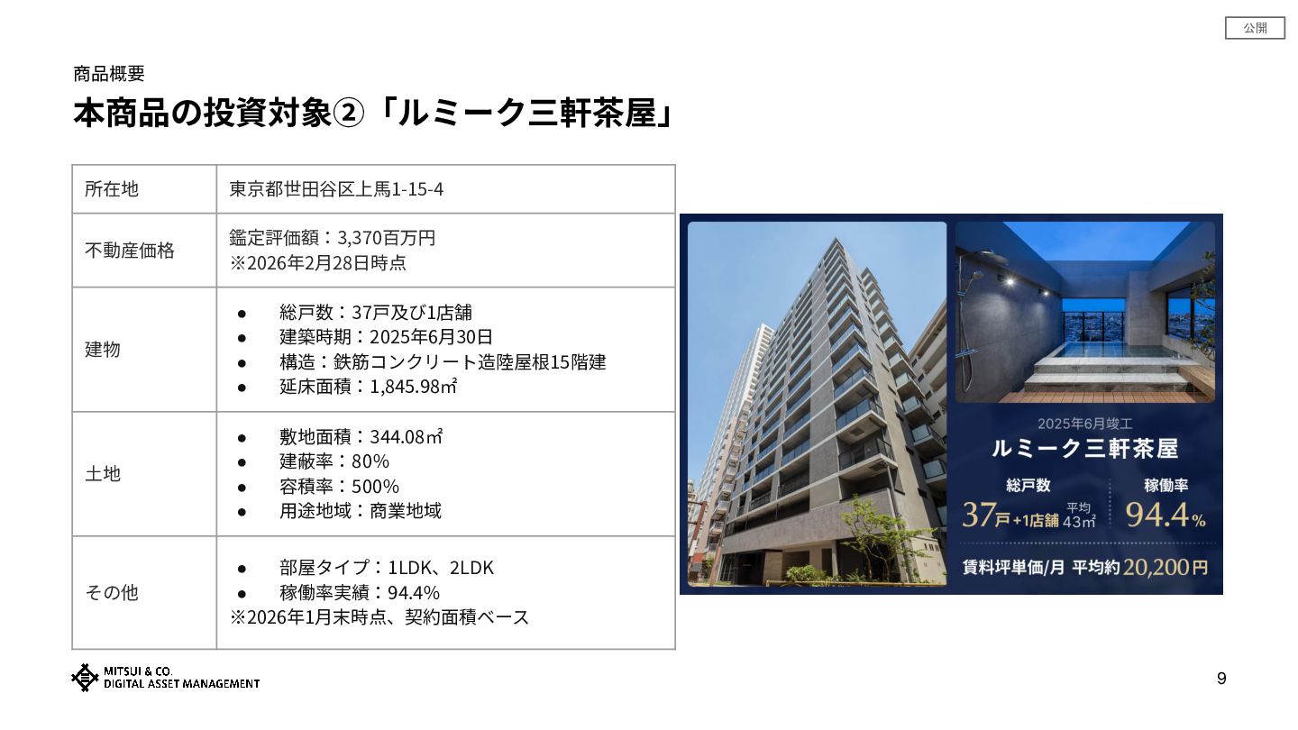 公開 商品概要 本商品の投資対象②「ルミーク三軒茶屋」 9 所在地 東京都世⽥⾕区上⾺1-15-4 不動産価格 鑑定評価額:3,370百万円 ※2026年2⽉28⽇時点 建物