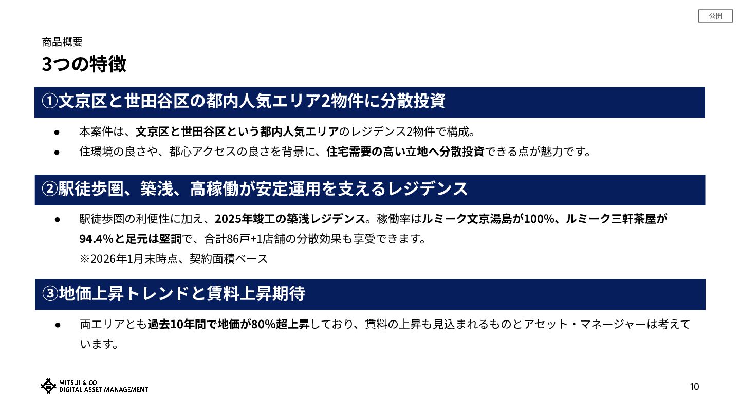 公開 ③地価上昇トレンドと賃料上昇期待 商品概要 3つの特徴 10 ①⽂京区と世⽥⾕区の都内⼈気エリア2物件に分散投資 • 本案件は、⽂京区と世⽥⾕区という都内⼈気エリアのレジデンス2物件で構成。 • 住環境の良さや、都⼼アクセスの良さを背景に、住宅需要の⾼い⽴地へ分散投資できる点が魅⼒です。