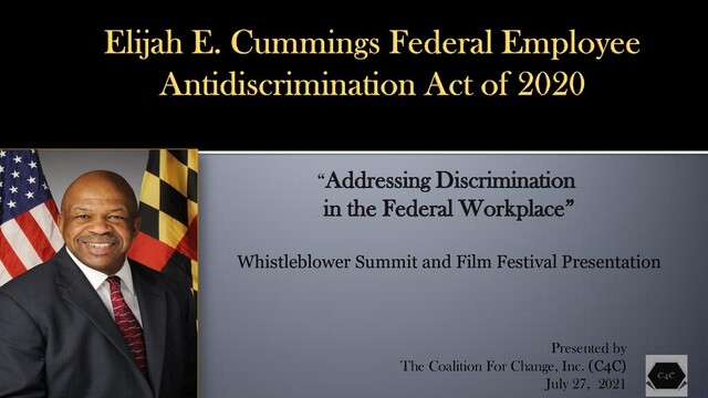 The Coalition For Change, Inc. (C4C) upload of the group's PowerPoint panel presentation entitled: Addressing Discrimination in the Federal Workplace. The panel discussed the Elijah Cummings Federal Employee Anti-discrimination Act. of 2020.