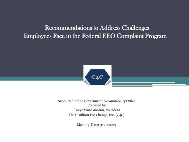 the goal as President Jimmy Carter and Congress intended when in 1978, "all equal opportunity the Federal employment enforcement and related functions" transferred from the Civil Service Commission to the EEOC. Today, like its predecessor, the EEOC remains lethargic in enforcing fair employment requirements in the Federal government. The EEOC-championed Federal Equal Employment Opportunity Complaint Program needs a complete overhaul. A thorough examination of the EEOC-regulated system is warranted. It is vital to grasp that the EEOC, "a Federal agency," acts as an administrative court. The EEOC's cache of Administrative Judges hears employment discrimination cases parties bring against Federal employers, including claims brought against the EEOC. Consequently, the EEOC's placement as an “enforcement” agency within the Executive Branch poses a conflict. It impedes its ability to serve as a neutral adjudicator. The EEOC rarely rules in favor of the aggrieved party alleging workplace discrimination In the infrequent cases when the EEOC finds discrimination and rules in favor of an aggrieved federal employee or job applicant, the EEOC seldom sanctions an agency commensurate with the unlawful offense. Instead, the EEOC’s practice is to exact a “lesser sanction” on an agency official who commits an unlawful act or fails to follow EEO complaint processing guidelines. Moreover, the EEOC tacitly resists framing EEO guidance reasonably. Given it will be subject to regulations it publishes. The C4C recognizes the scope of the Government Accountability Office study. We also recognize the focus areas requested by the Committee on Oversight and Reform. Therefore, we present viable recommendations to improve the Federal EEO complaint process, deliver relief for victims of retaliation, and institute accountability for civil rights violators. If implemented, these reforms will address the longstanding concerns of advocacy groups, legal scholars, lawmakers, and Federal whistleblowers who bring mixed case complaints to the EEOC’s redress system. They will also complement C4C’s EEO reform measures Congress passed into law under the Elijah Cummings Federal Employee Antidiscrimination Act. Tanya Ward Jordan, President The Coalition For Change, Inc. (C4C) Approved by: Paulette Taylor, Civil Rights Chair Edgar Dion Lee, Senior Investigator Analyst Juanita Winkey Kennedy, Communications Chair Joyce E. Megginson, Public Relations Officer RECOMMENDATIONS