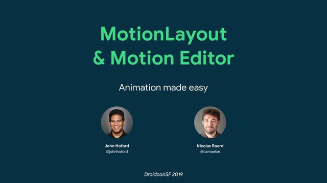 MotionLayout is a new class in ConstraintLayout 2.0 dramatically simplifying the creation of animations, particularly related to handling motion and touch events. This session will cover what the library is capable of, where it makes sense to use it, and how to take advantage of the upcoming Motion Editor in Android Studio to quickly add motion to your application!