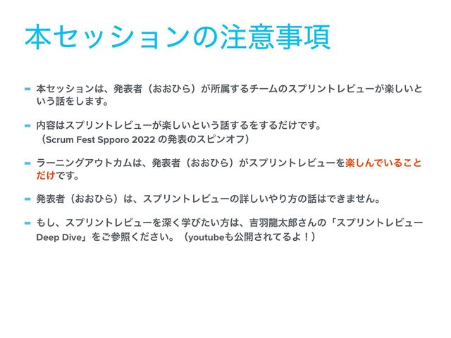 - ຊηογϣϯɺൃදऀʢ͓͓ͻΒʣ͕ॴଐ͢ΔνʔϜͷεϓϦϯτϨϏϡʔָ͕͍͠ͱ ͍͏Λ͠·͢ɻ - ༰εϓϦϯτϨϏϡʔָ͕͍͠ͱ͍͏͢ΔΛ͢Δ͚ͩͰ͢ɻ ʢScrum Fest Spporo 2022