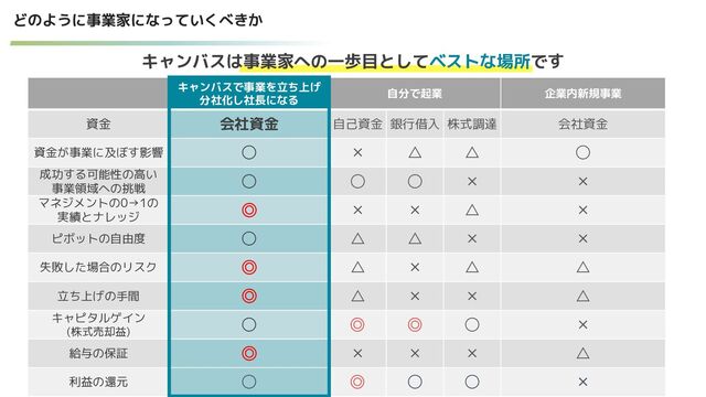 1. キャンバスは事業家への一歩目としてベストな場所です   キャンバスで事業を立ち上げ 分社化し社長になる 自分で起業 企業内新規事業 資金 会社資金 自己資金 銀行借入