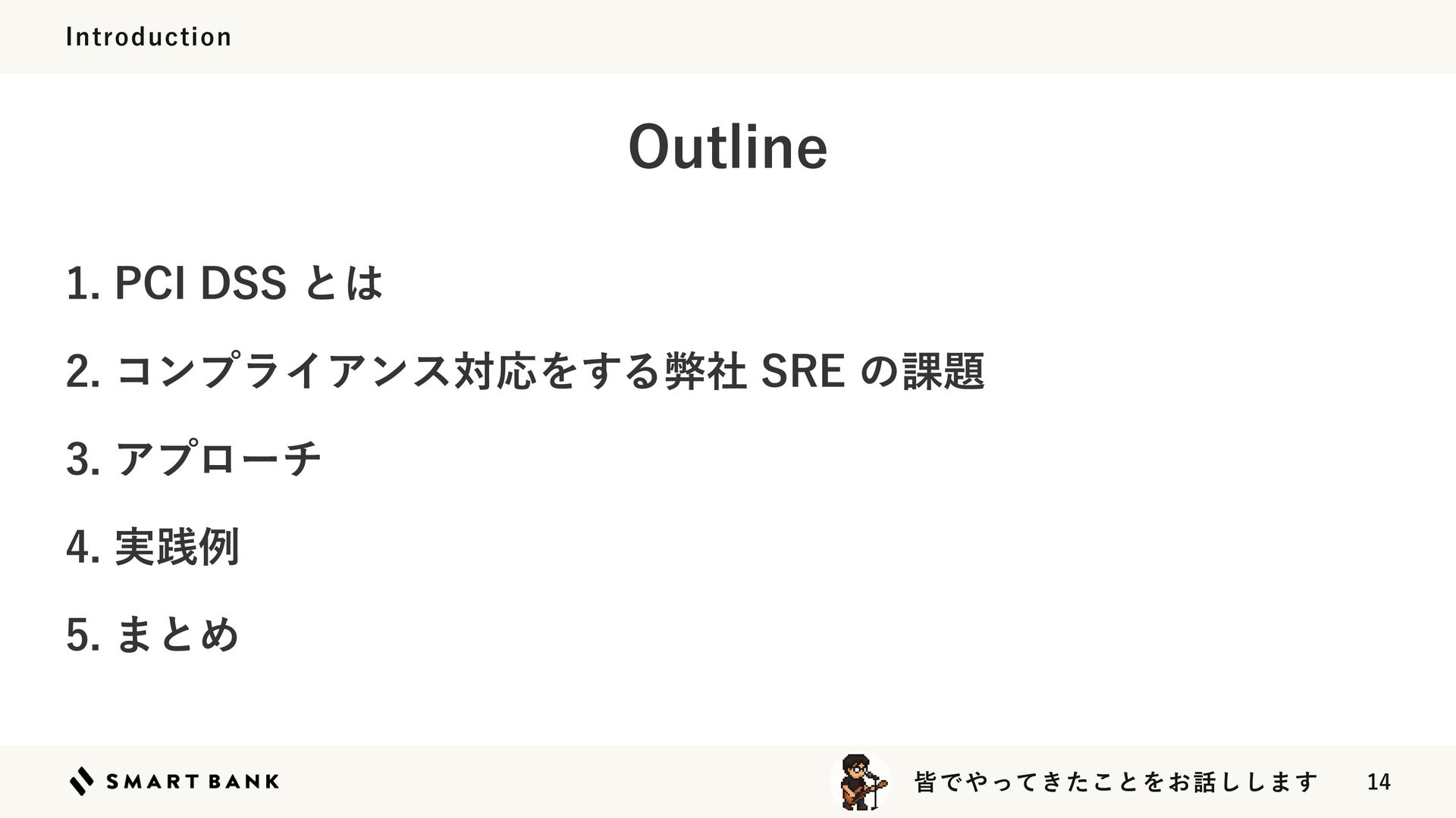 *OUSPEVDUJPO 1$*%44ͱ ίϯϓϥΠΞϯεରԠΛ͢Δฐࣾ43&ͷ՝ Ξϓϩʔν ࣮ફྫ ·ͱΊ 0VUMJOF օͰ͖ͬͯͨ͜ͱΛ͓͠͠·͢