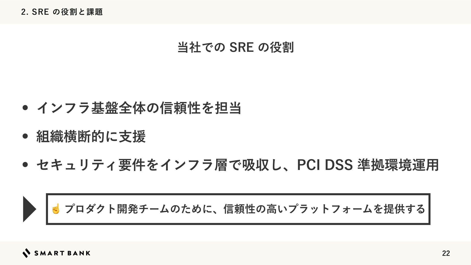 43&ͷׂͱ՝ w Πϯϑϥج൫શମͷ৴པੑΛ୲ w ৫ԣஅతʹࢧԉ w ηΩϡϦςΟཁ݅ΛΠϯϑϥͰٵऩ͠ɺ1$*%44४ڌڥӡ༻ ࣾͰͷ43&ͷׂ ☝ϓϩμΫτ։ൃνʔϜͷͨΊʹɺ৴པੑͷߴ͍ϓϥοτϑΥʔϜΛఏڙ͢Δ