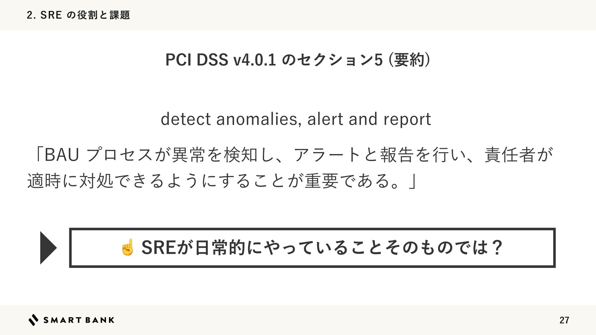 43&ͷׂͱ՝ EFUFDUBOPNBMJFT BMFSUBOESFQPSU ʮ#"6ϓϩηε͕ҟৗΛݕ͠ɺΞϥʔτͱใࠂΛߦ͍ɺऀ͕ ద࣌ʹରॲͰ͖ΔΑ͏ʹ͢Δ͜ͱ͕ॏཁͰ͋Δɻʯ 1$*%44WͷηΫγϣϯ ཁ ☝43&͕ৗతʹ͍ͬͯΔ͜ͱͦͷͷͰʁ