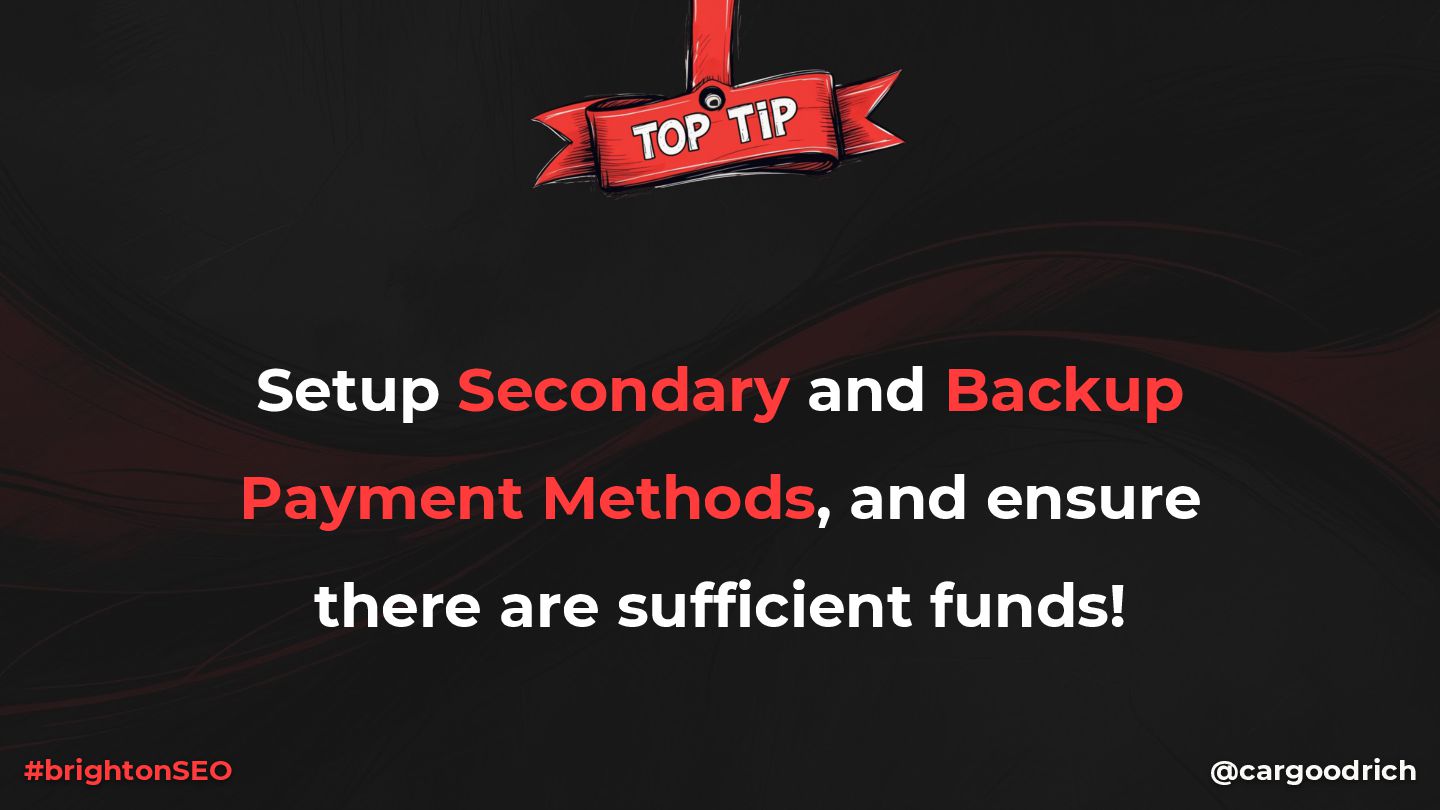 6. Setup Secondary and Backup Payment Methods, and ensure there are