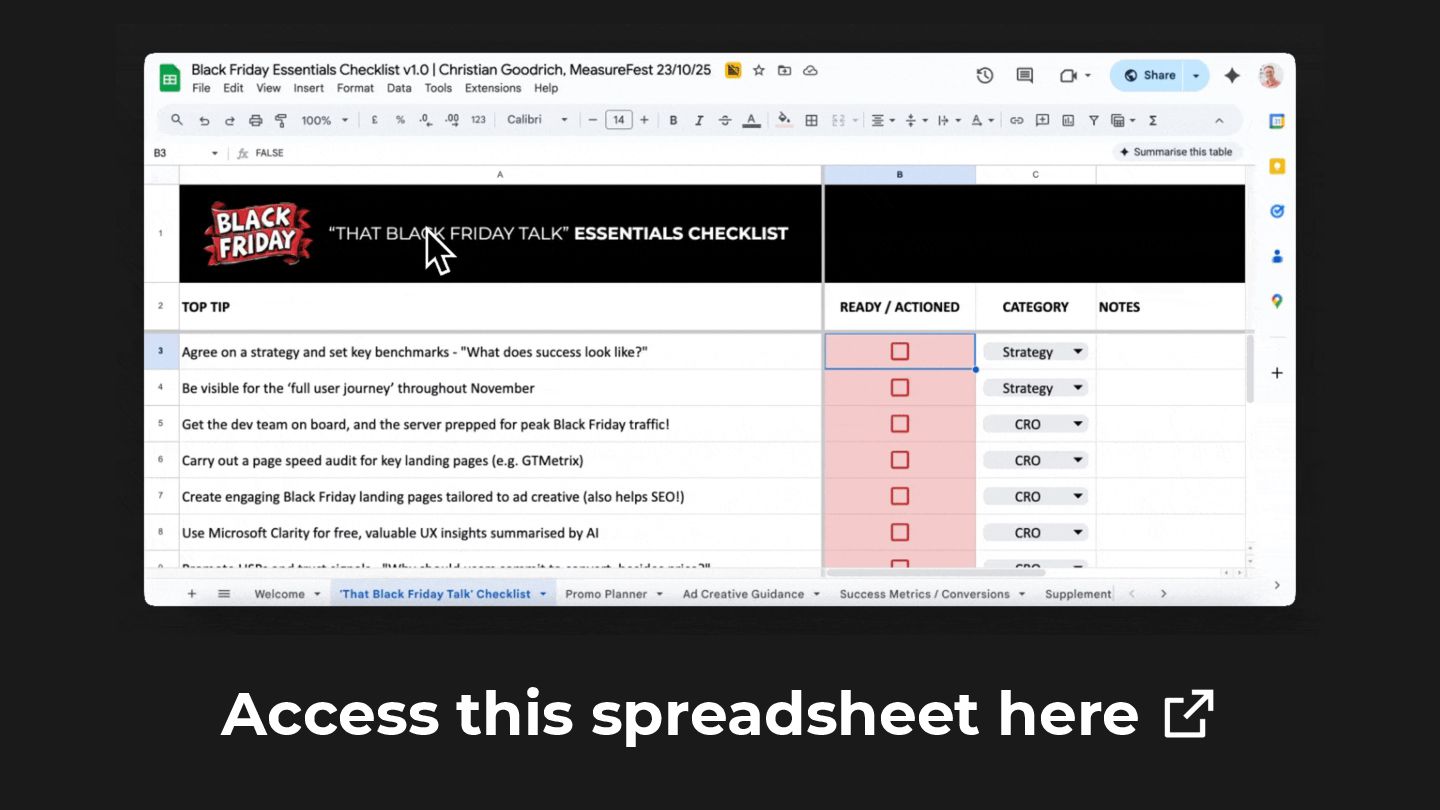 Use this editable template to plan, prioritise, and measure your own Black Friday campaigns. It includes all 16 top tips from the session in a practical checklist format (as well as some bonus tips!), ready to copy and adapt for client or in-house strategies.