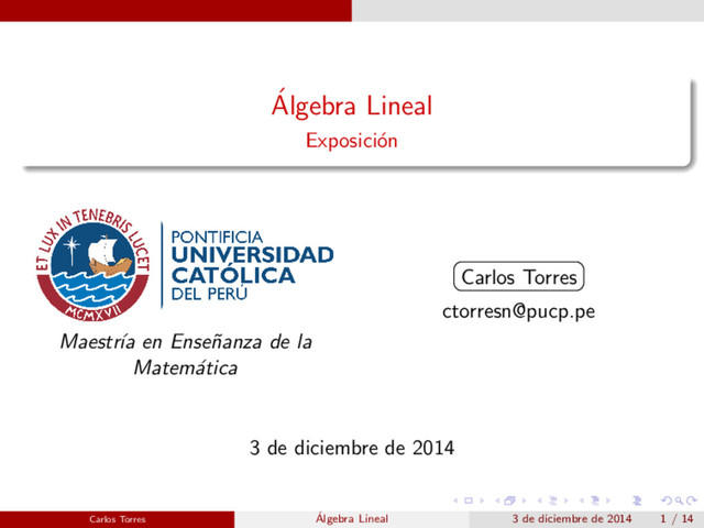 de la Matem´ atica Carlos Torres [email protected] 3 de diciembre de 2014 Carlos Torres ´ Algebra Lineal 3 de diciembre de 2014 1 / 14