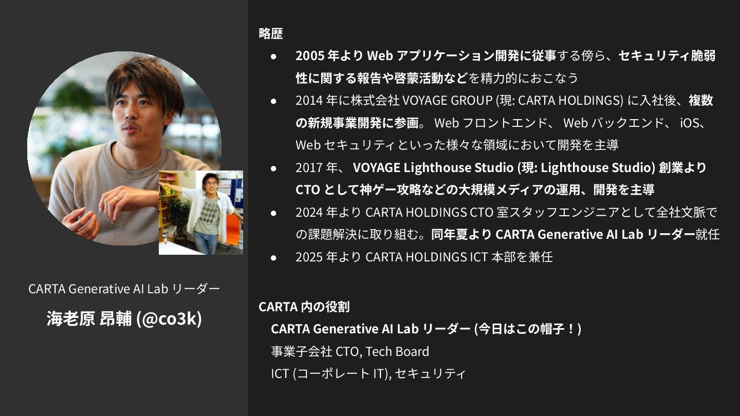 2005 年より Web アプリケーション開発に従事する傍ら、セキュリティ脆弱 性に関する報告や啓蒙活動などを精⼒的におこなう • 2014 年に株式会社 VOYAGE GROUP (現: CARTA HOLDINGS) に⼊社後、複数 の新規事業開発に参画。 Web フロントエンド、 Web バックエンド、 iOS、 Web セキュリティといった様々な領域において開発を主導 • 2017 年、 VOYAGE Lighthouse Studio (現: Lighthouse Studio) 創業より CTO として神ゲー攻略などの⼤規模メディアの運⽤、開発を主導 • 2024 年より CARTA HOLDINGS CTO 室スタッフエンジニアとして全社⽂脈で の課題解決に取り組む。同年夏より CARTA Generative AI Lab リーダー就任 • 2025 年より CARTA HOLDINGS ICT 本部を兼任 CARTA 内の役割  CARTA Generative AI Lab リーダー (今⽇はこの帽⼦!)  事業⼦会社 CTO, Tech Board  ICT (コーポレート IT), セキュリティ