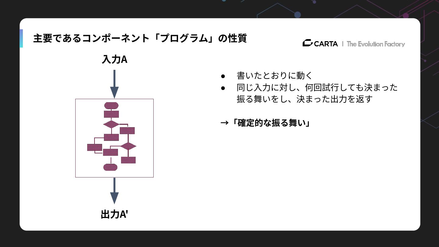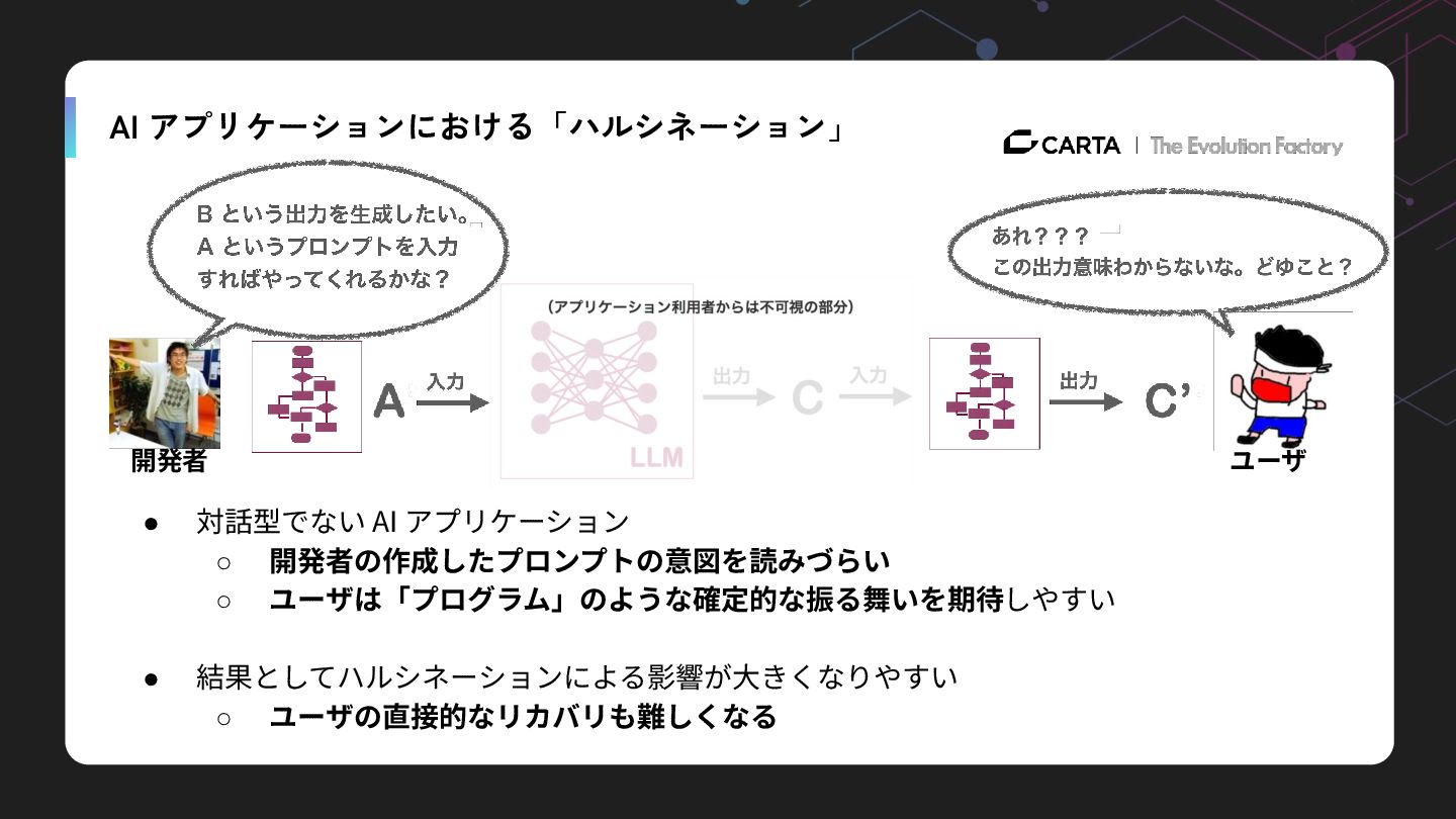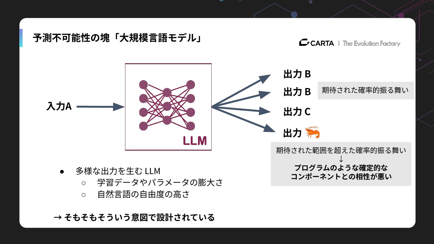 🦐 期待された範囲を超えた確率的振る舞い ↓ プログラムのような確定的な コンポーネントとの相性が悪い • 多様な出⼒を⽣む LLM ◦ 学習データやパラメータの膨⼤さ ◦ ⾃然⾔語の⾃由度の⾼さ → そもそもそういう意図で設計されている