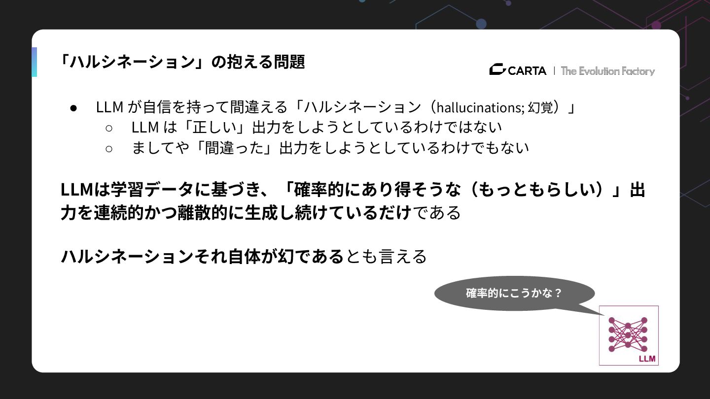 LLMは学習データに基づき、「確率的にあり得そうな(もっともらしい)」出 ⼒を連続的かつ離散的に⽣成し続けているだけである ハルシネーションそれ⾃体が幻であるとも⾔える 確率的にこうかな?