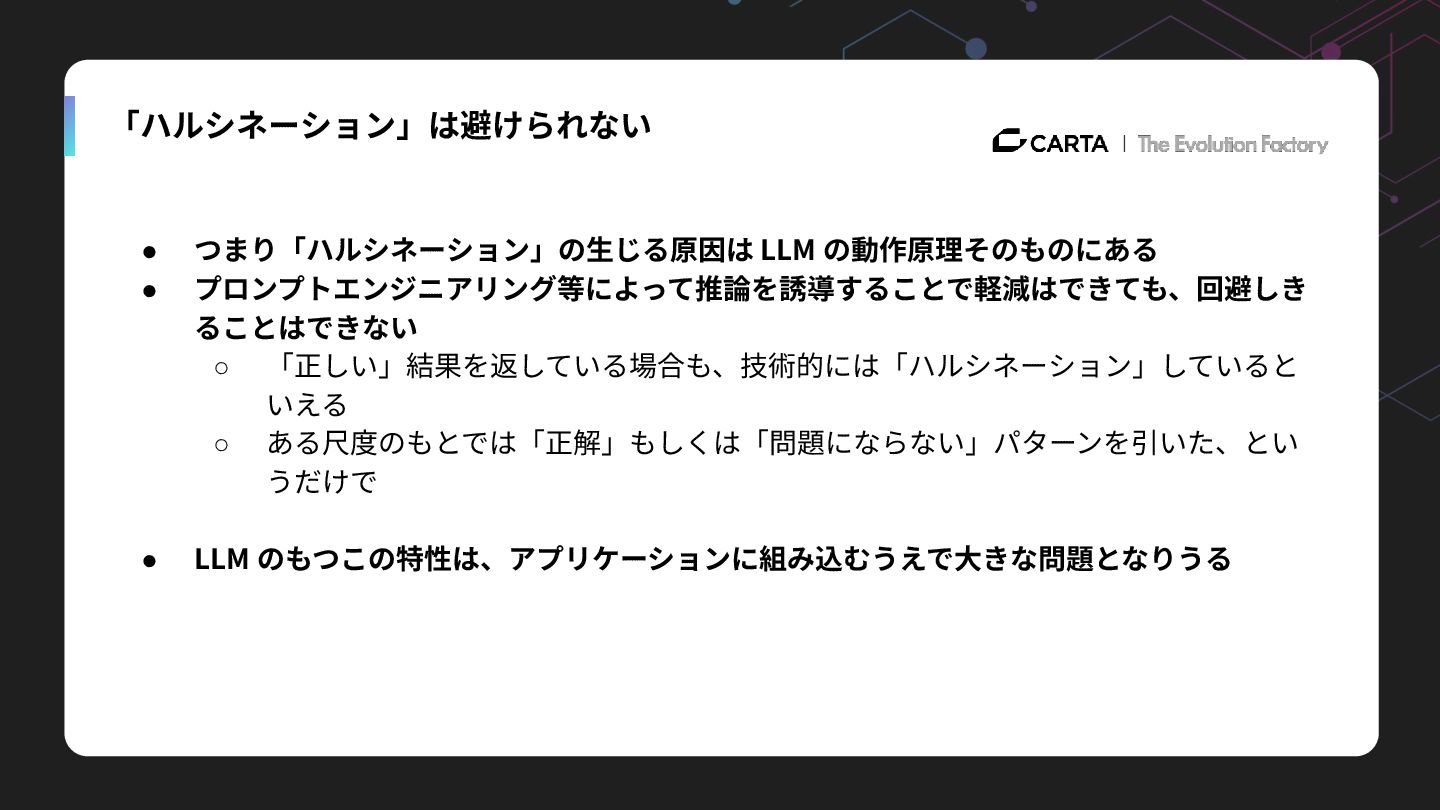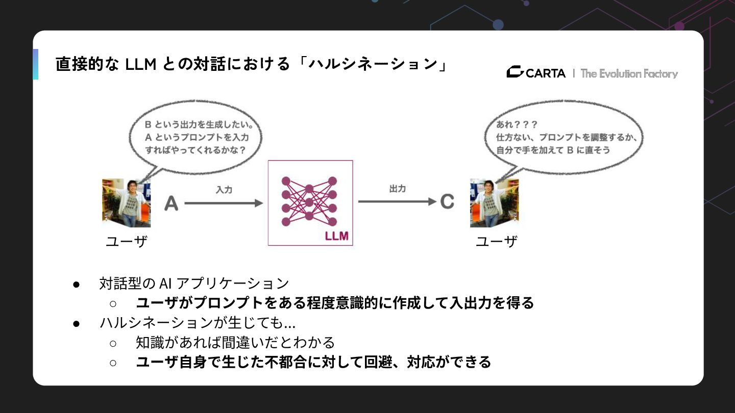 ハルシネーションが⽣じても... ◦ 知識があれば間違いだとわかる ◦ ユーザ⾃⾝で⽣じた不都合に対して回避、対応ができる ユーザ ユーザ