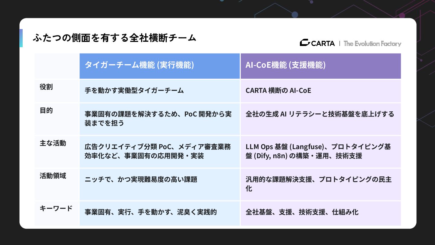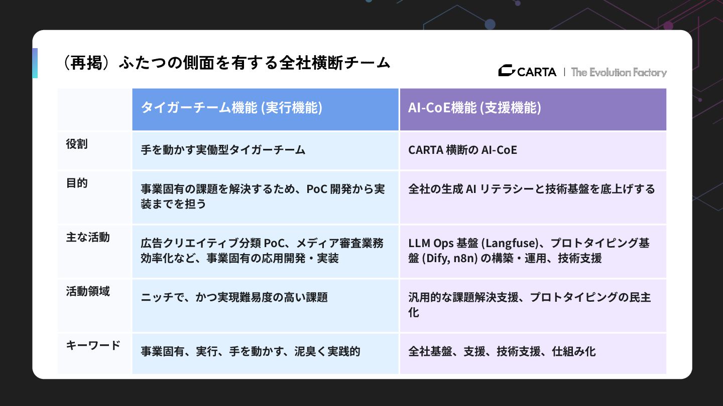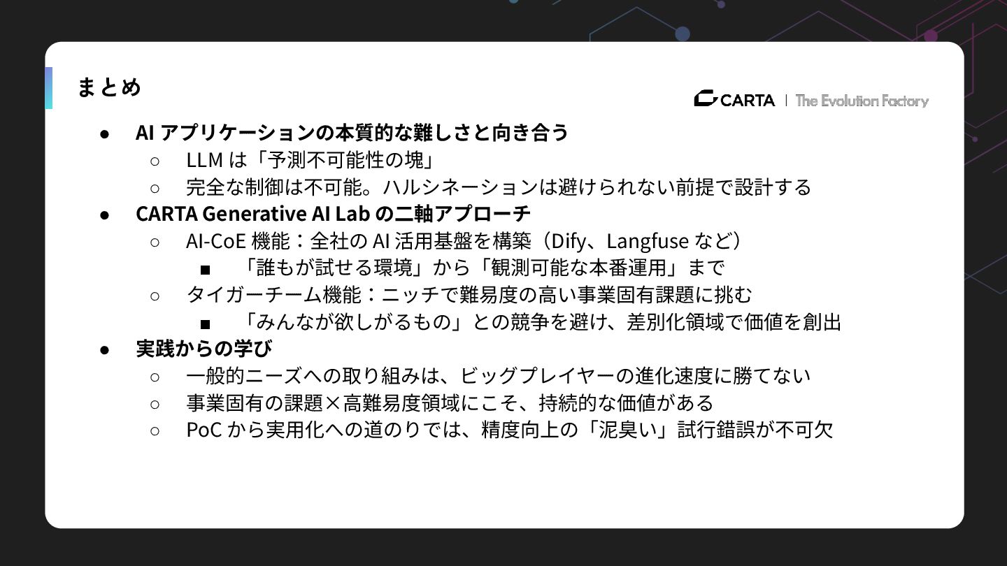 CARTA Generative AI Lab の⼆軸アプローチ ◦ AI-CoE 機能:全社の AI 活⽤基盤を構築(Dify、Langfuse など) ▪ 「誰もが試せる環境」から「観測可能な本番運⽤」まで ◦ タイガーチーム機能:ニッチで難易度の⾼い事業固有課題に挑む ▪ 「みんなが欲しがるもの」との競争を避け、差別化領域で価値を創出 • 実践からの学び ◦ ⼀般的ニーズへの取り組みは、ビッグプレイヤーの進化速度に勝てない ◦ 事業固有の課題×⾼難易度領域にこそ、持続的な価値がある ◦ PoC から実⽤化への道のりでは、精度向上の「泥臭い」試⾏錯誤が不可⽋