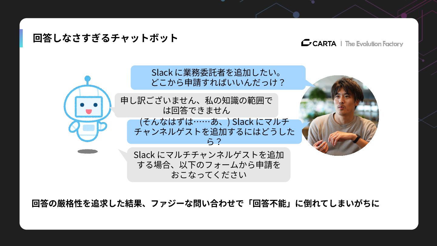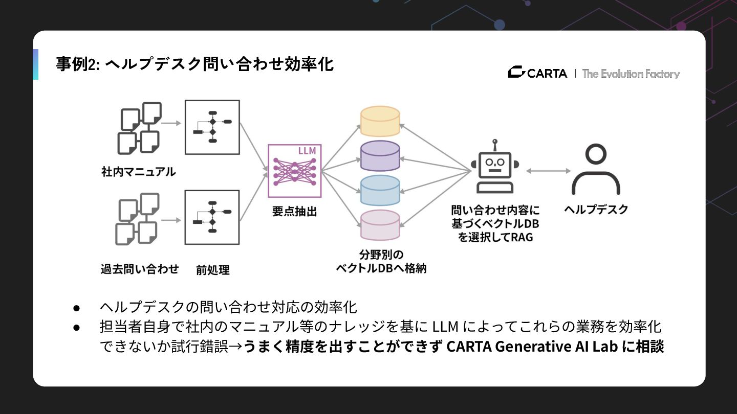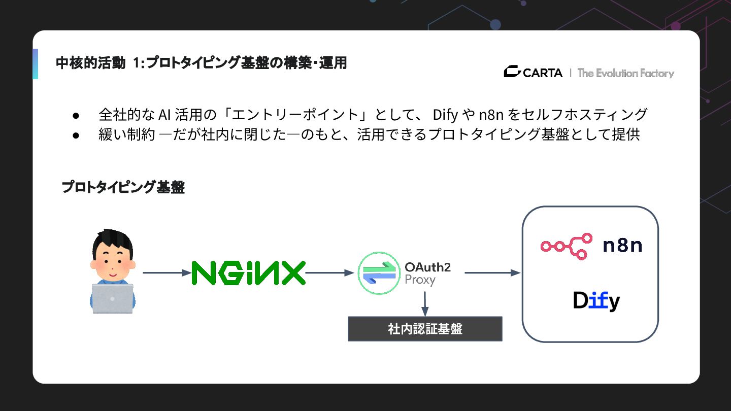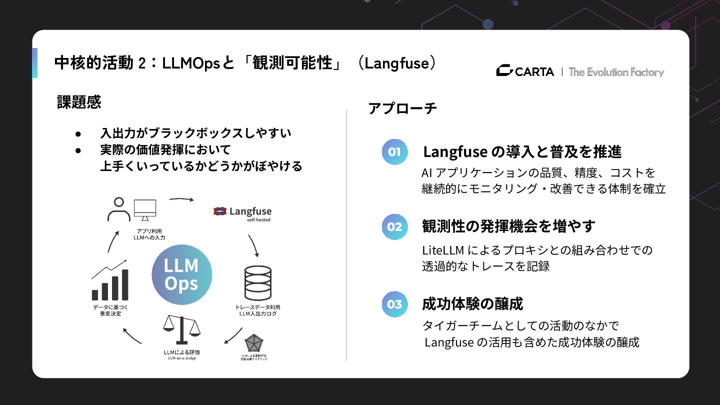 CARTA Generative AI Lab の⼆軸アプローチ ◦ AI-CoE 機能:全社の AI 活⽤基盤を構築(Dify、Langfuse など) ▪ 「誰もが試せる環境」から「観測可能な本番運⽤」まで ◦ タイガーチーム機能:ニッチで難易度の⾼い事業固有課題に挑む ▪ 「みんなが欲しがるもの」との競争を避け、差別化領域で価値を創出 • 実践からの学び ◦ ⼀般的ニーズへの取り組みは、ビッグプレイヤーの進化速度に勝てない ◦ 事業固有の課題×⾼難易度領域にこそ、持続的な価値がある ◦ PoC から実⽤化への道のりでは、精度向上の「泥臭い」試⾏錯誤が不可⽋