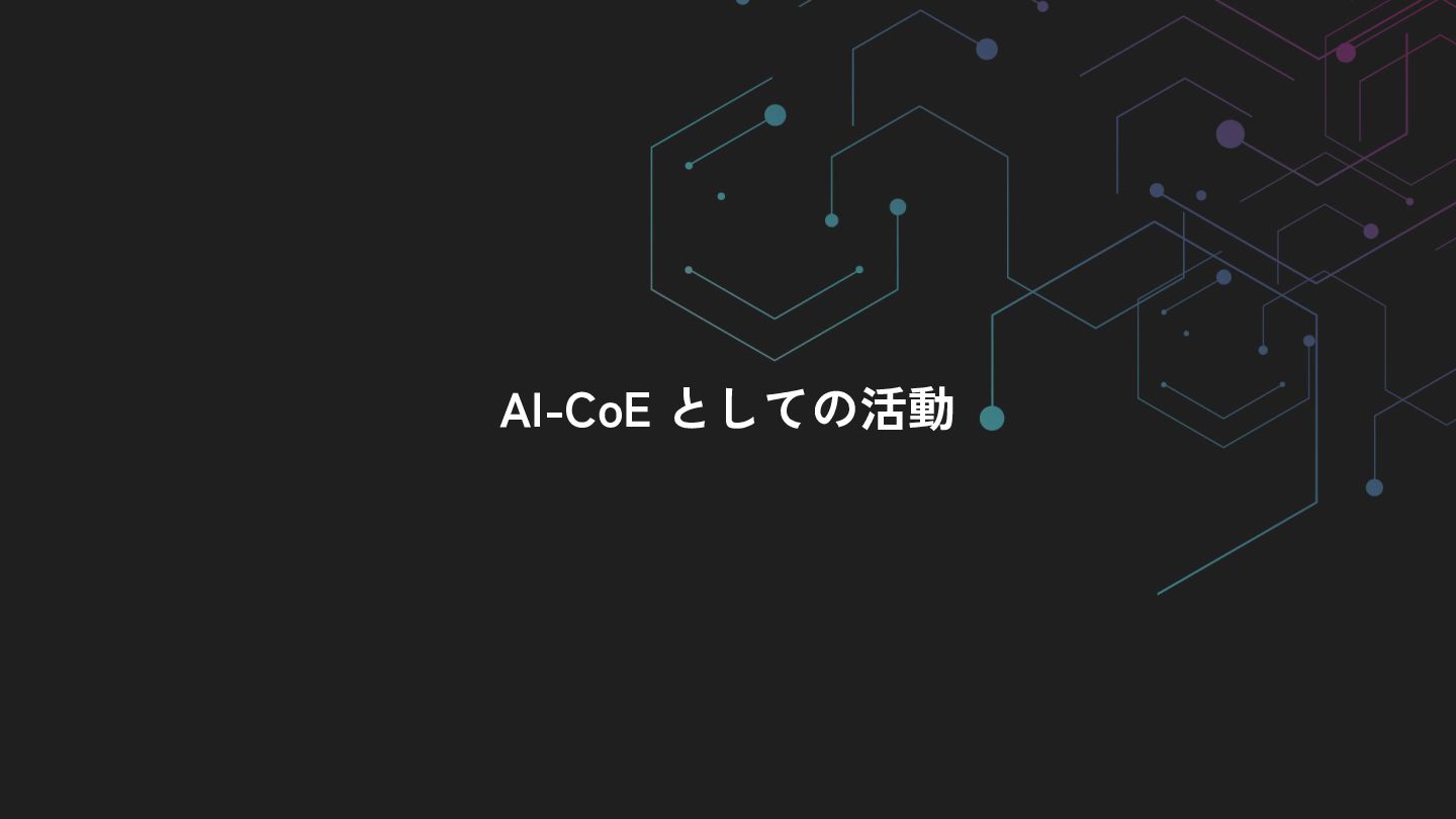 AI アプリケーションの難しさと向き合う • AI-CoE 基盤とタイガーチーム機能の⼆軸で全社横断しながら AI 活⽤推進する • 「みんながほしがるもの」は作らない