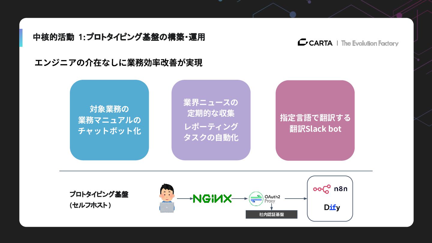 タイガーチームは このあたりの 課題を狙う この辺の課題は 世の中で 解決されることを 期待 このあたりの課題が CARTA 全体で解けるように AI-CoE による基盤構築 ドメインエキスパート⾃⾝ での Dify 等による PoC 利⽤事例の蓄積による横展開 タイガーチームとして 本格利⽤に向けた アプリケーション開発