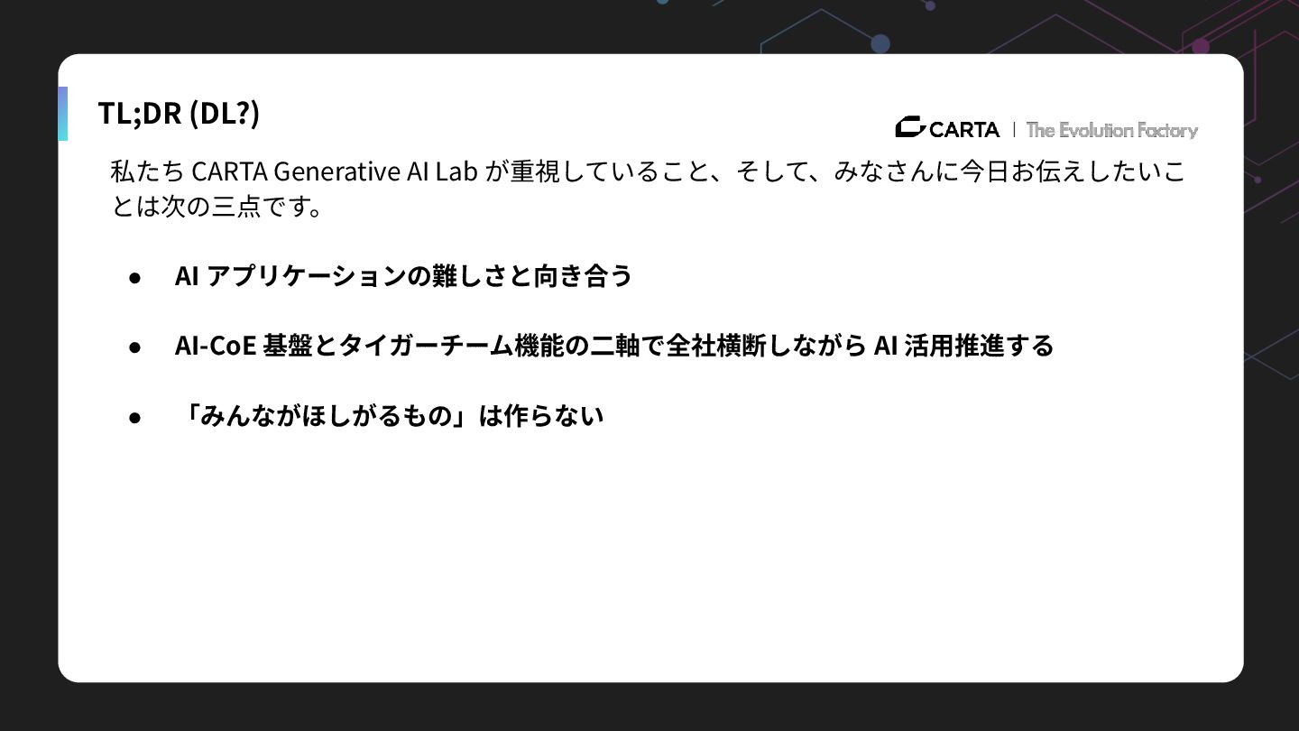 2. TL;DR (DL?) 私たち CARTA Generative AI Lab が重視していること、そして、みなさんに今⽇お伝えしたいこ とは次の三点です。 •