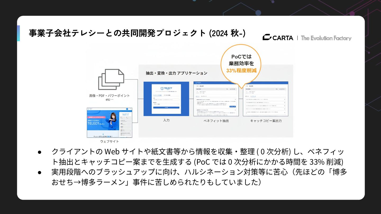 し、ベネフィッ ト抽出とキャッチコピー案までを⽣成する (PoC では 0 次分析にかかる時間を 33% 削減) • 実⽤段階へのブラッシュアップに向け、ハルシネーション対策等に苦⼼(先ほどの「博多 おせち→博多ラーメン」事件に苦しめられたりもしていました)