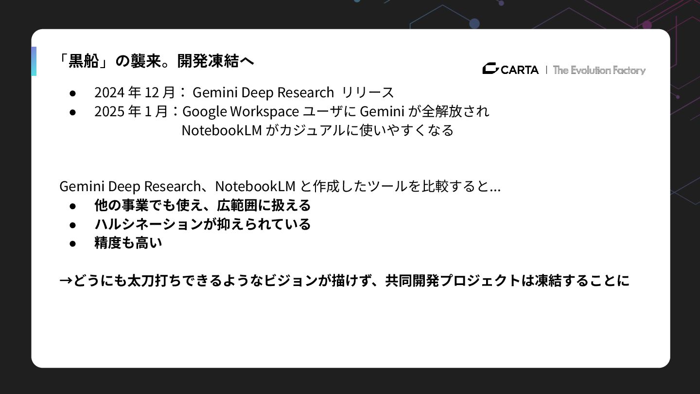 • 2025 年 1 ⽉:Google Workspace ユーザに Gemini が全解放され NotebookLM がカジュアルに使いやすくなる Gemini Deep Research、NotebookLM と作成したツールを⽐較すると... • 他の事業でも使え、広範囲に扱える • ハルシネーションが抑えられている • 精度も⾼い →どうにも太⼑打ちできるようなビジョンが描けず、共同開発プロジェクトは凍結することに