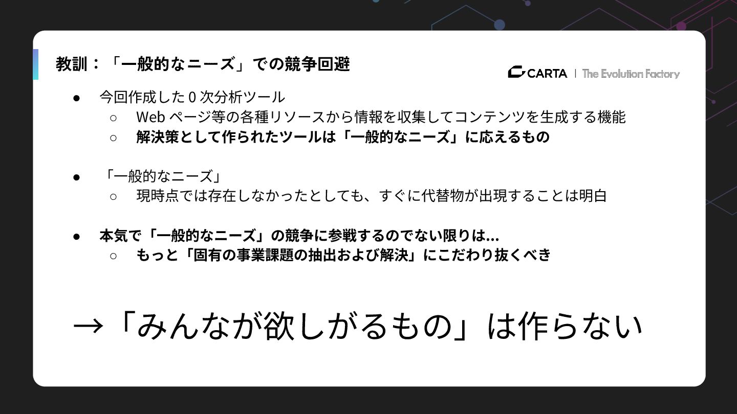 • 「⼀般的なニーズ」 ◦ 現時点では存在しなかったとしても、すぐに代替物が出現することは明⽩ • 本気で「⼀般的なニーズ」の競争に参戦するのでない限りは... ◦ もっと「固有の事業課題の抽出および解決」にこだわり抜くべき →「みんなが欲しがるもの」は作らない