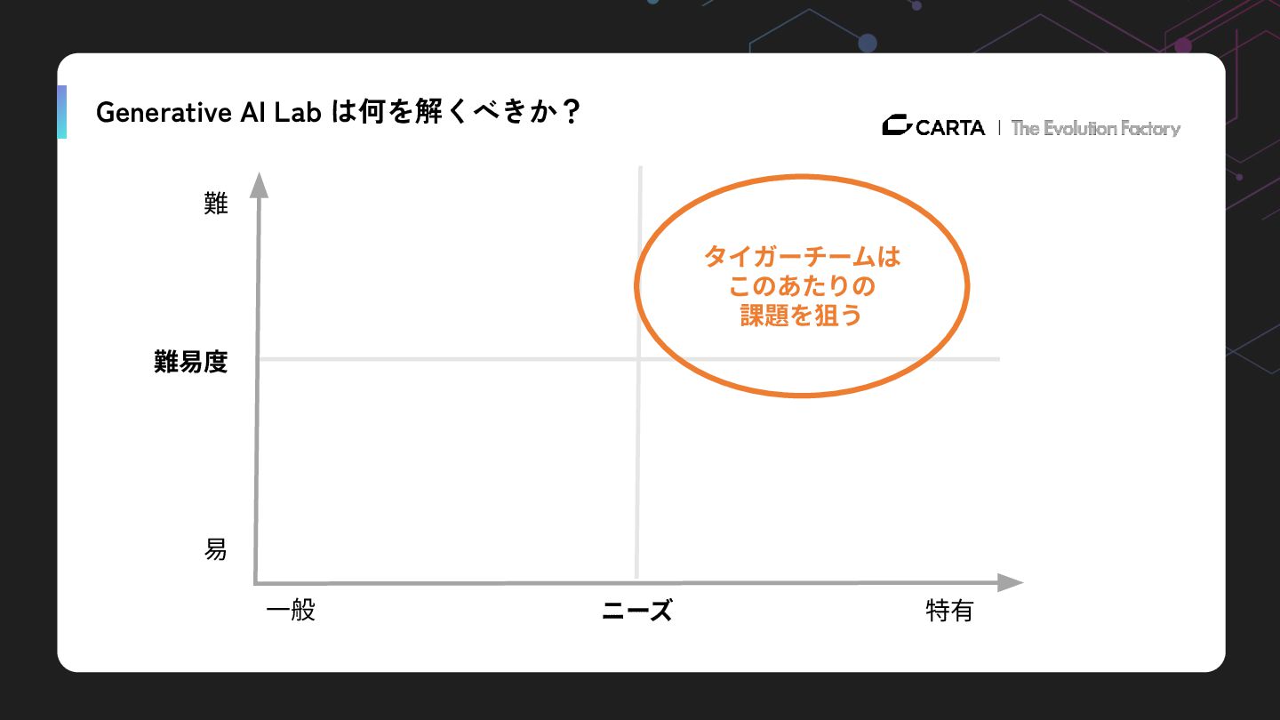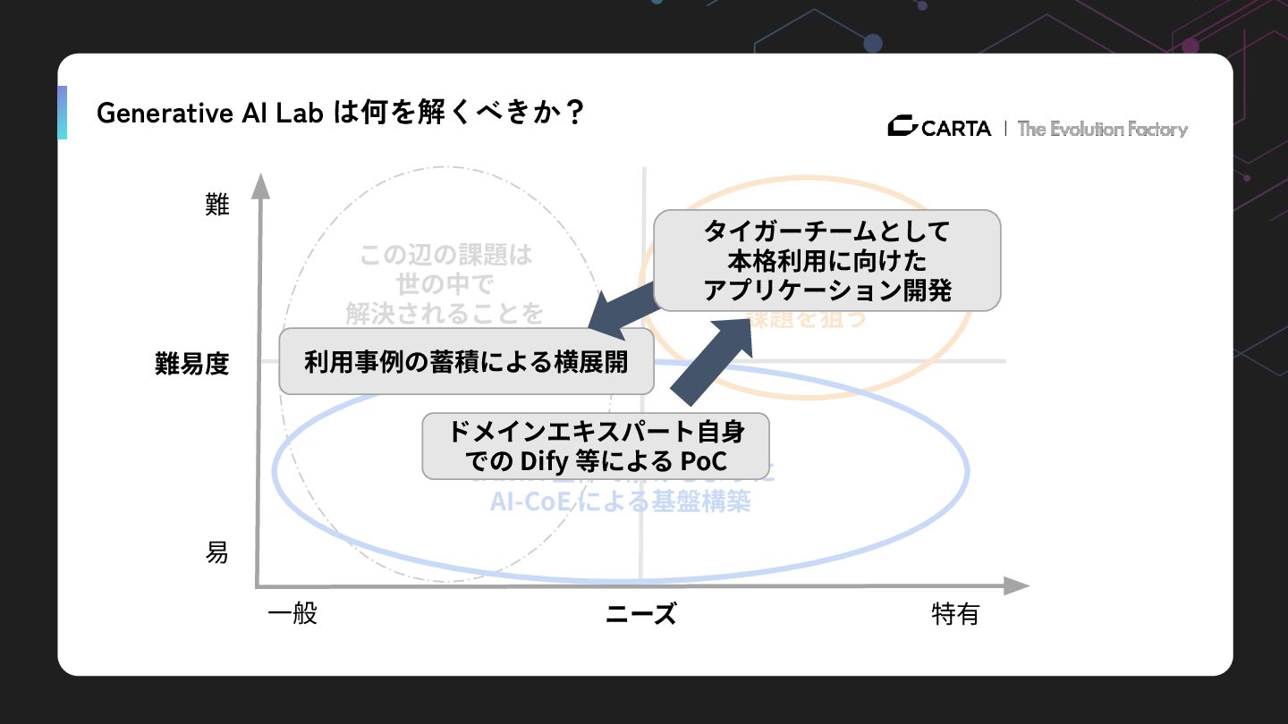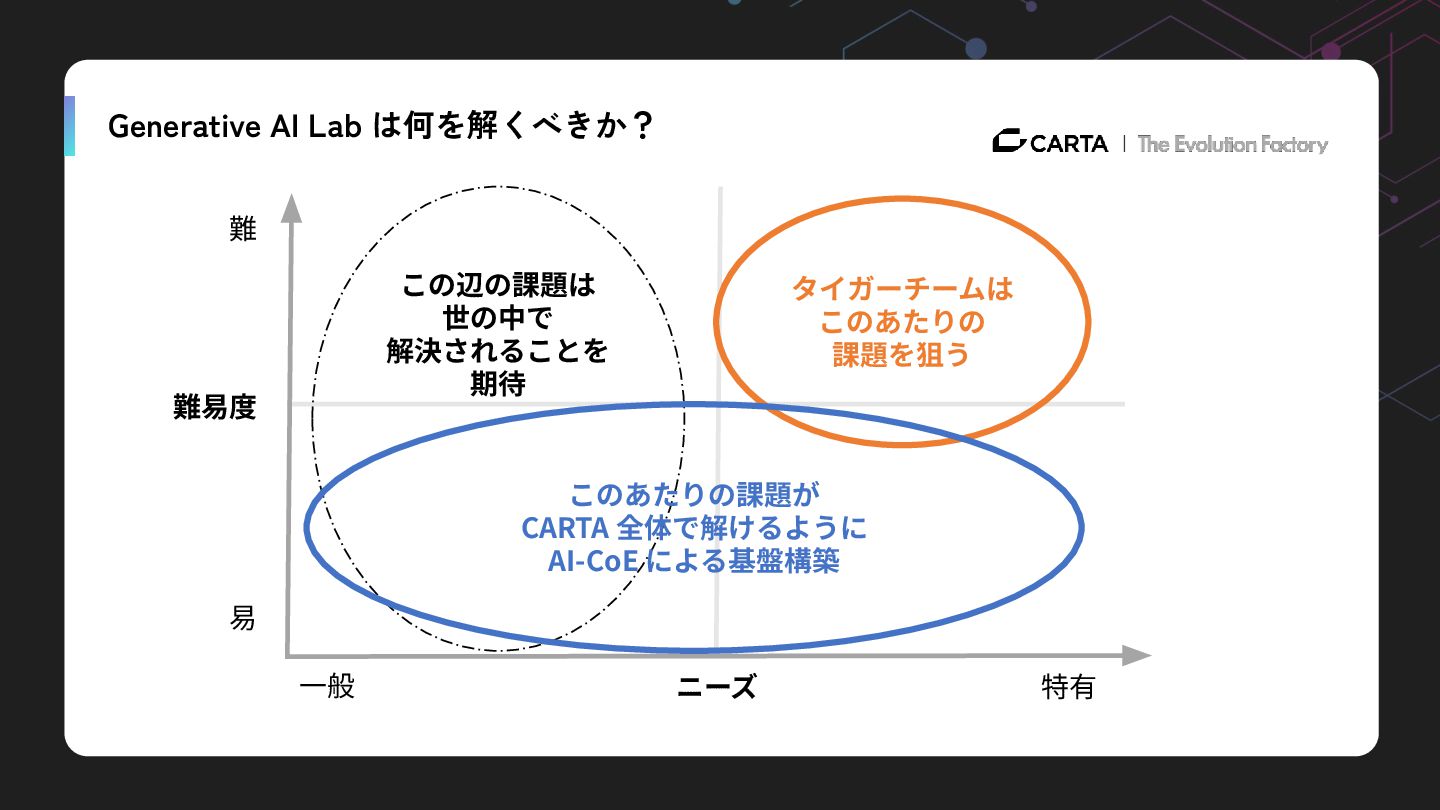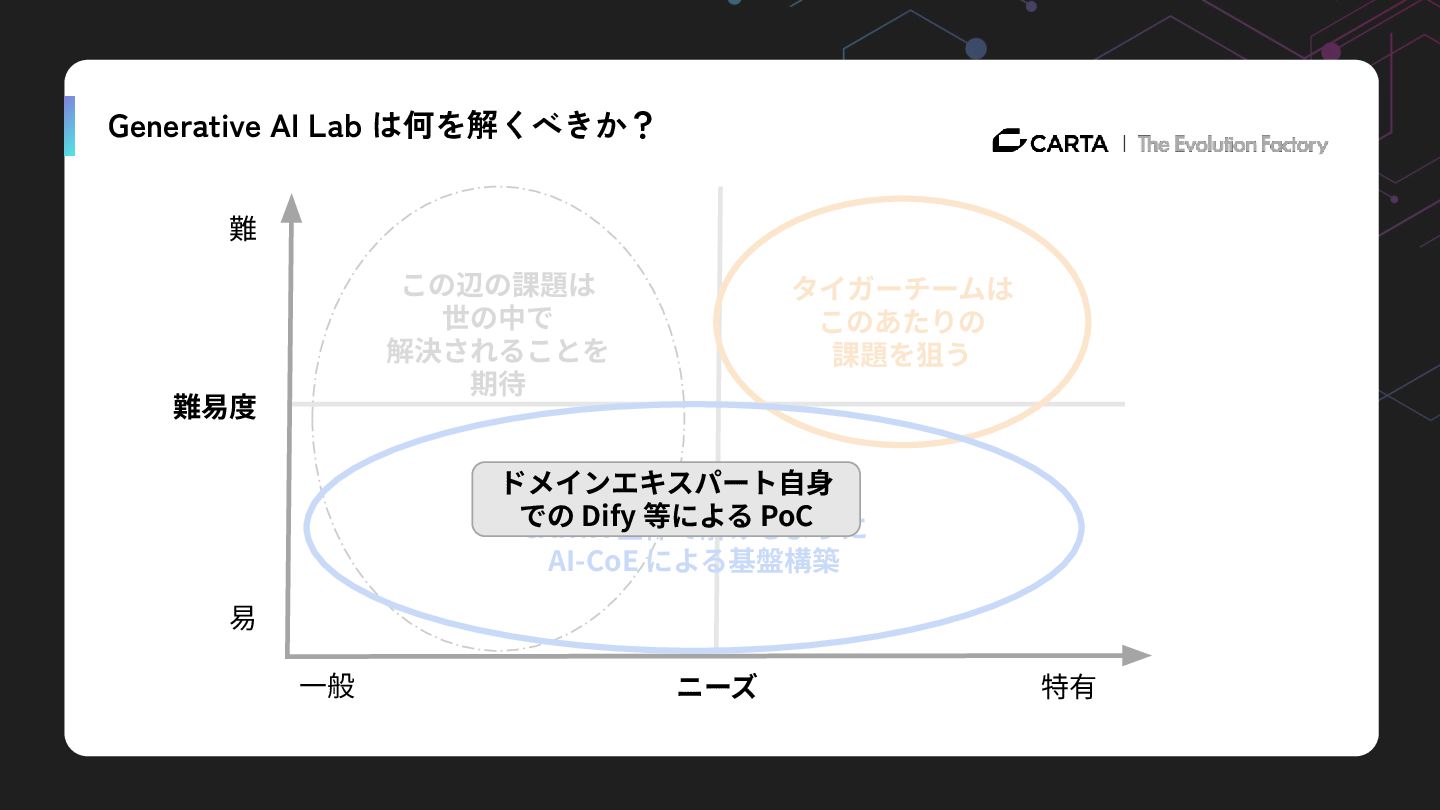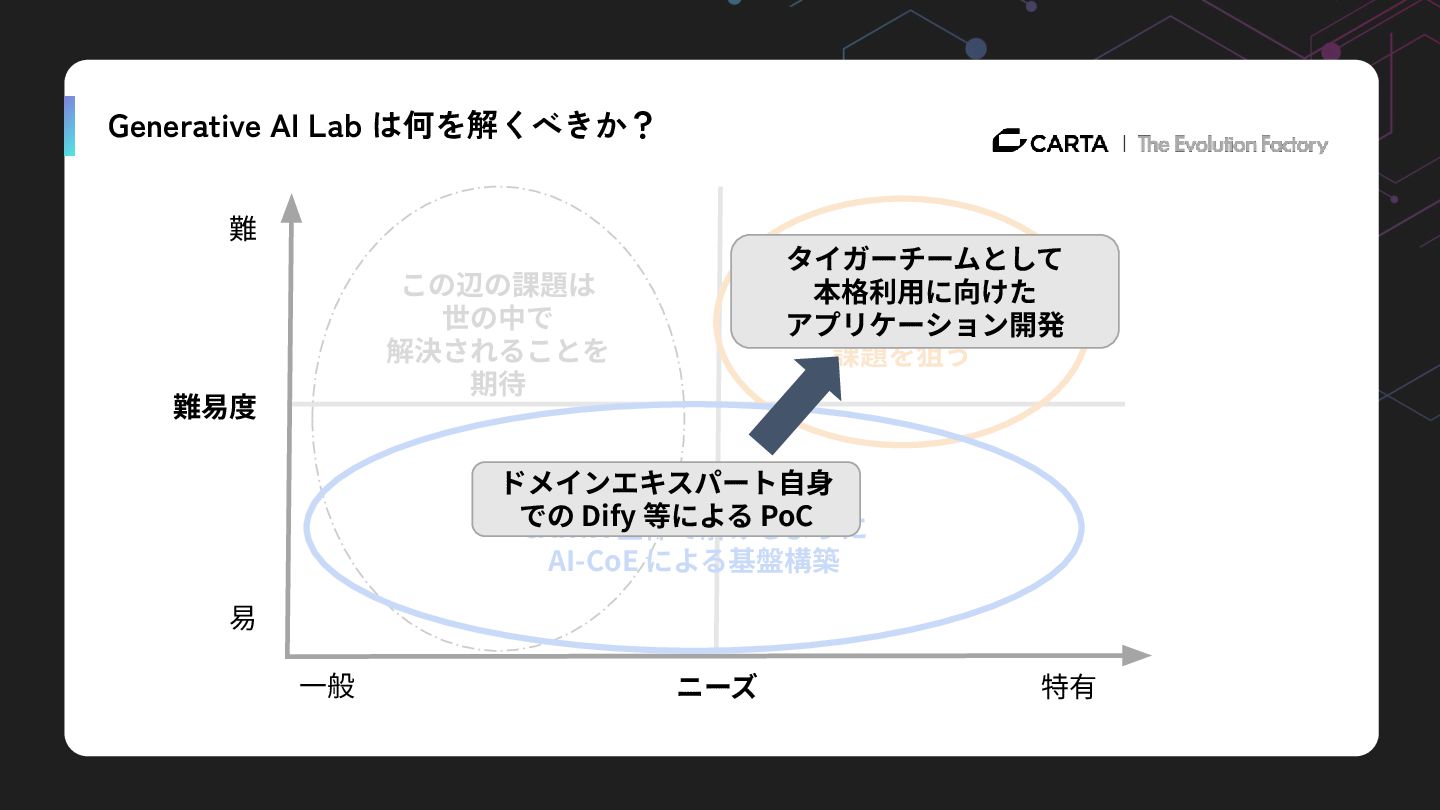 タイガーチームは このあたりの 課題を狙う この辺の課題は 世の中で 解決されることを 期待 このあたりの課題が CARTA 全体で解けるように AI-CoE による基盤構築 ドメインエキスパート⾃⾝ での Dify 等による PoC