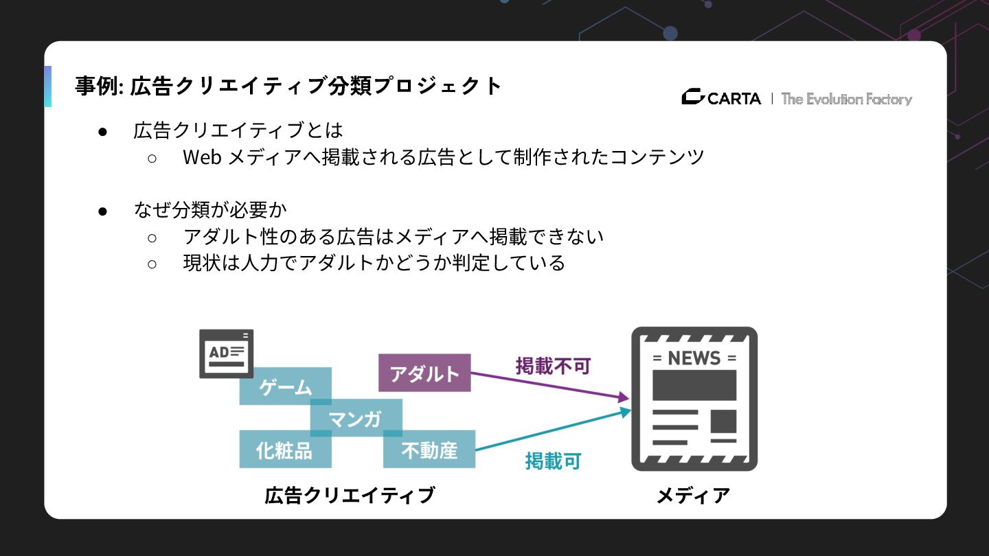 23. 事例: 広告クリエイティブ分類プロジェクト • 広告クリエイティブとは ◦ Web メディアへ掲載される広告として制作されたコンテンツ • なぜ分類が必要か ◦