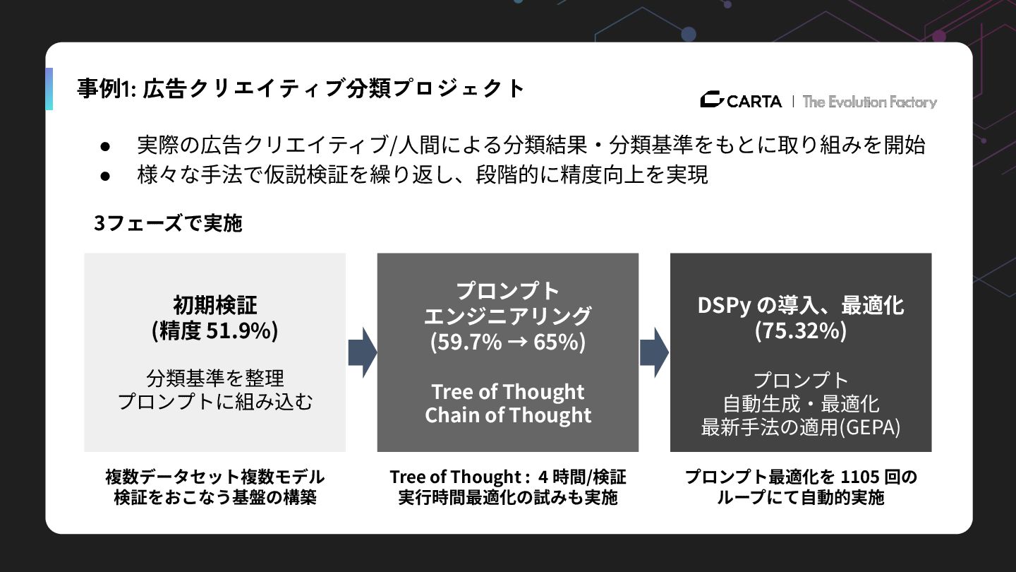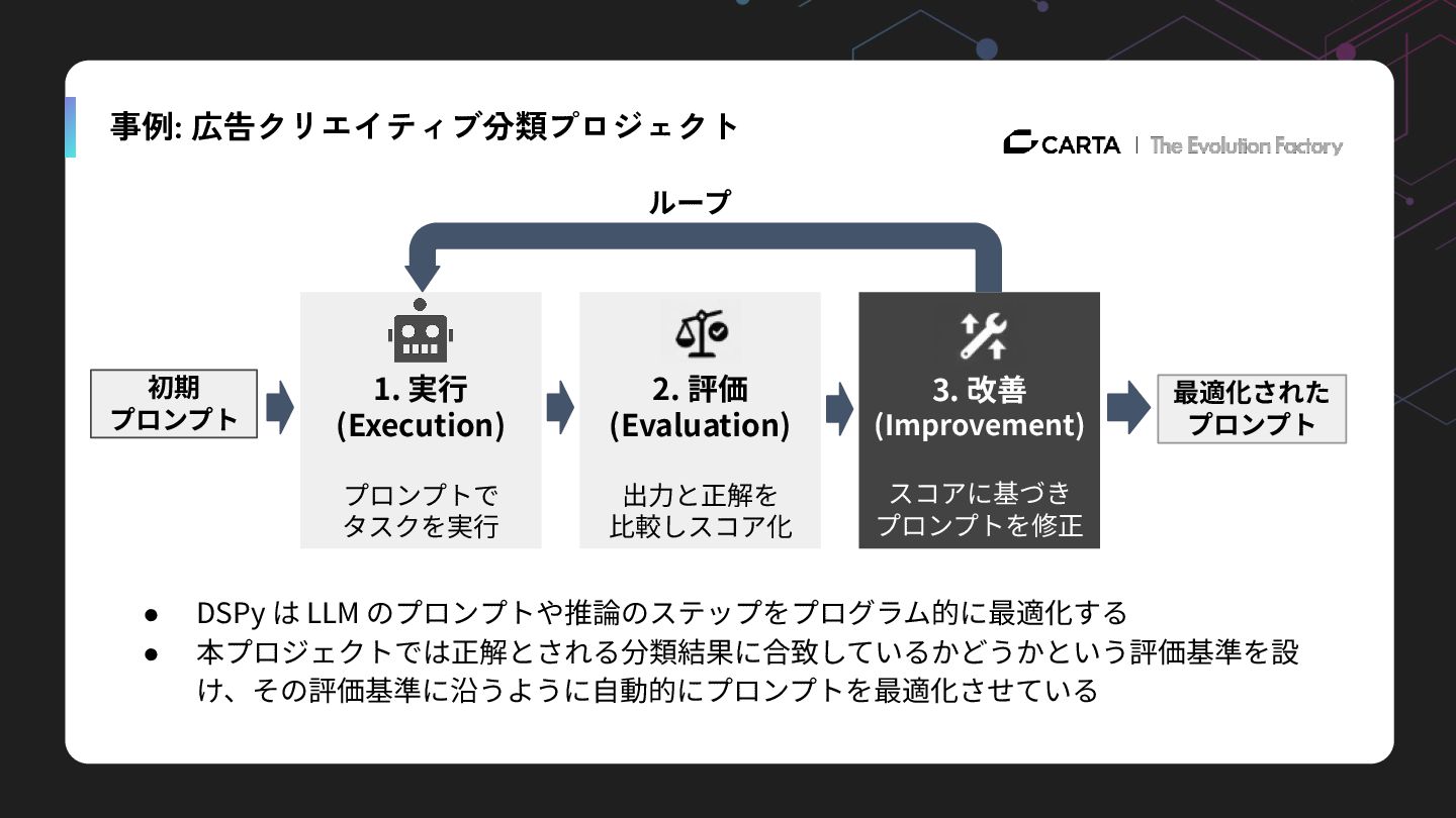 25. 事例: 広告クリエイティブ分類プロジェクト • DSPy は LLM のプロンプトや推論のステップをプログラム的に最適化する • 本プロジェクトでは正解とされる分類結果に合致しているかどうかという評価基準を設 け、その評価基準に沿うように⾃動的にプロンプトを最適化させている