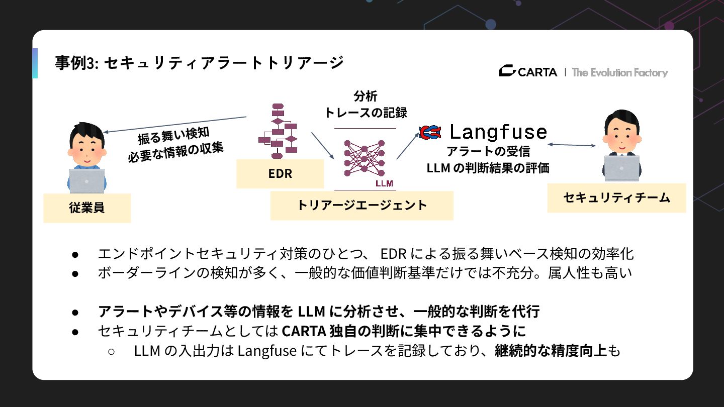 LLM に分析させ、⼀般的な判断を代⾏ • セキュリティチームとしては CARTA 独⾃の判断に集中できるように ◦ LLM の⼊出⼒は Langfuse にてトレースを記録しており、継続的な精度向上も 振る舞い検知 必要な情報の収集 セキュリティチーム アラートの受信 LLM の判断結果の評価 分析 トレースの記録 従業員 EDR トリアージエージェント