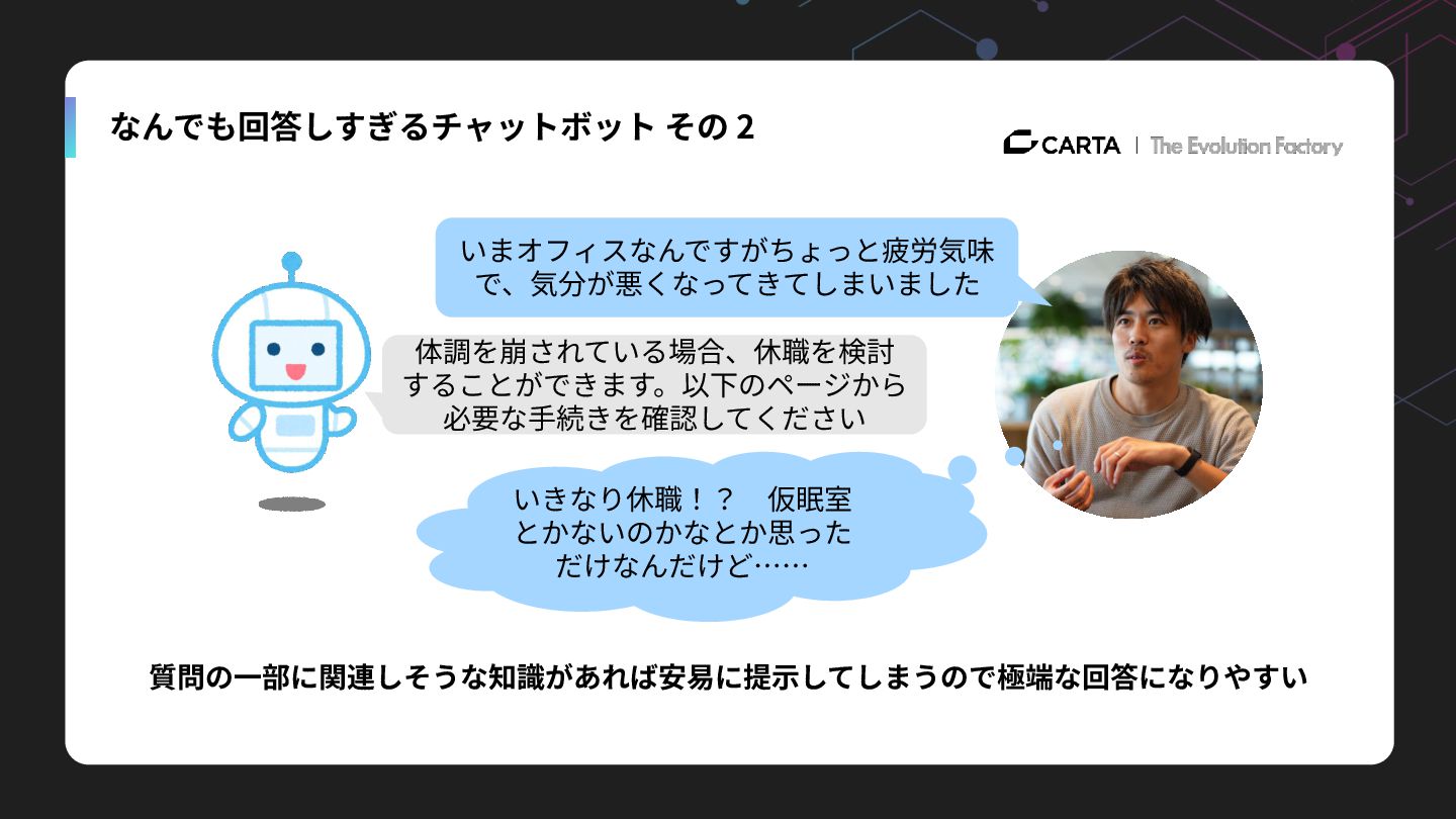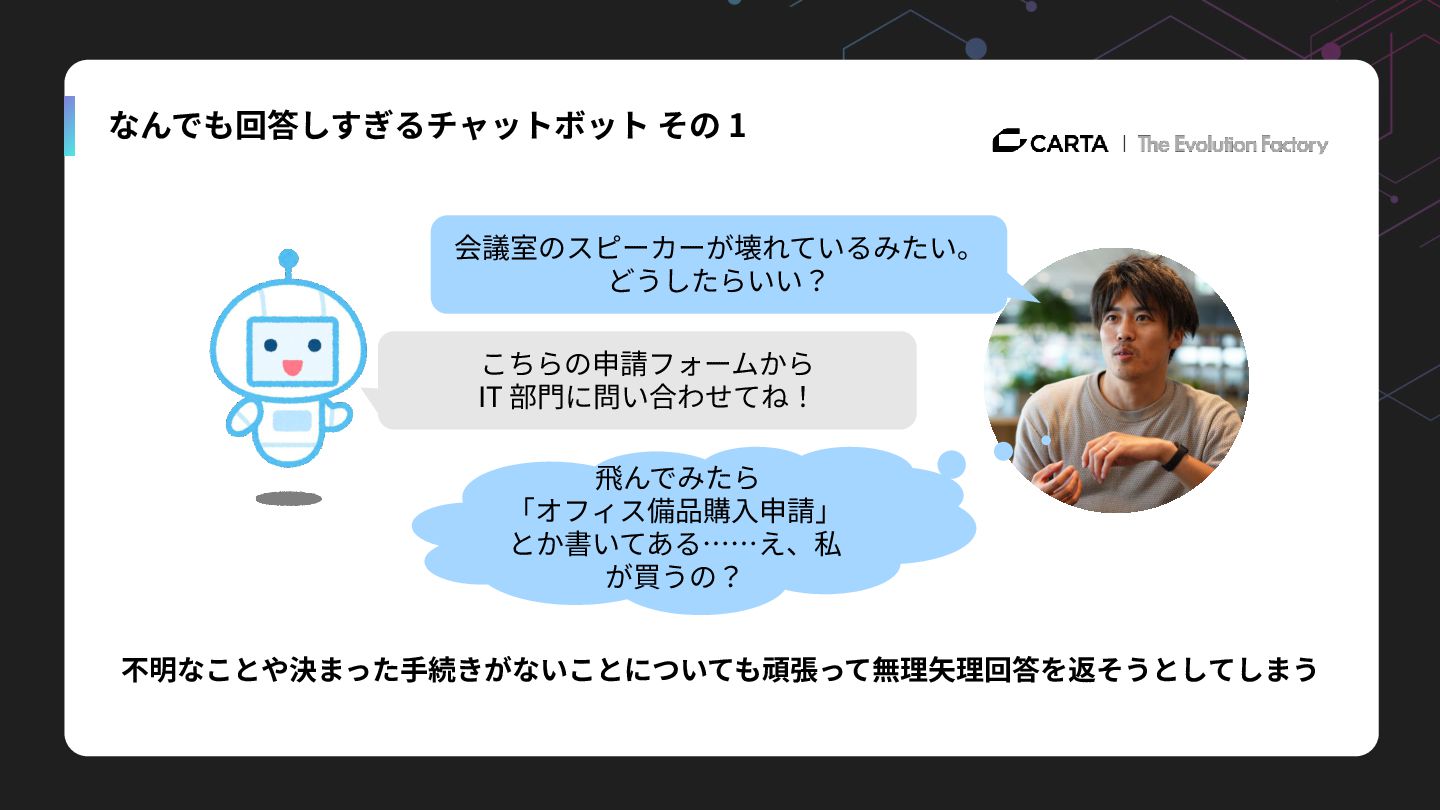 3. なんでも回答しすぎるチャットボット その 1 会議室のスピーカーが壊れているみたい。 どうしたらいい? こちらの申請フォームから IT 部⾨に問い合わせてね! ⾶んでみたら 「オフィス備品購⼊申請」